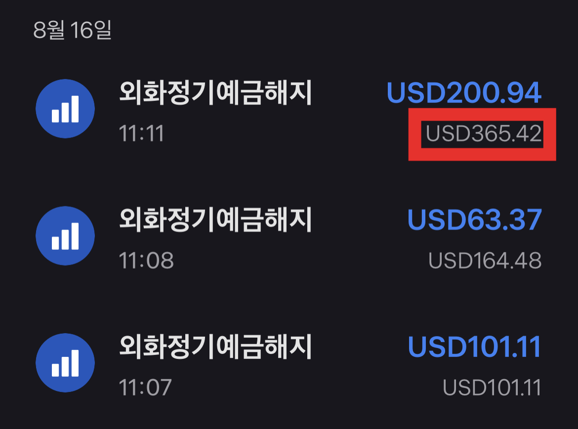 3개월이 된 시점에 3개로 나누어 들었던 외화정기예금을 모두 해지하니 365.42$가 되었네요. 약 3개월만에 2.75$의 이자가 붙은 달러가 돌아왔습니다. 365.42$를 한꺼번에 예치하는 것이 편하다는 생각이 들어 정기예금을 신규로 가입해봅니다.
