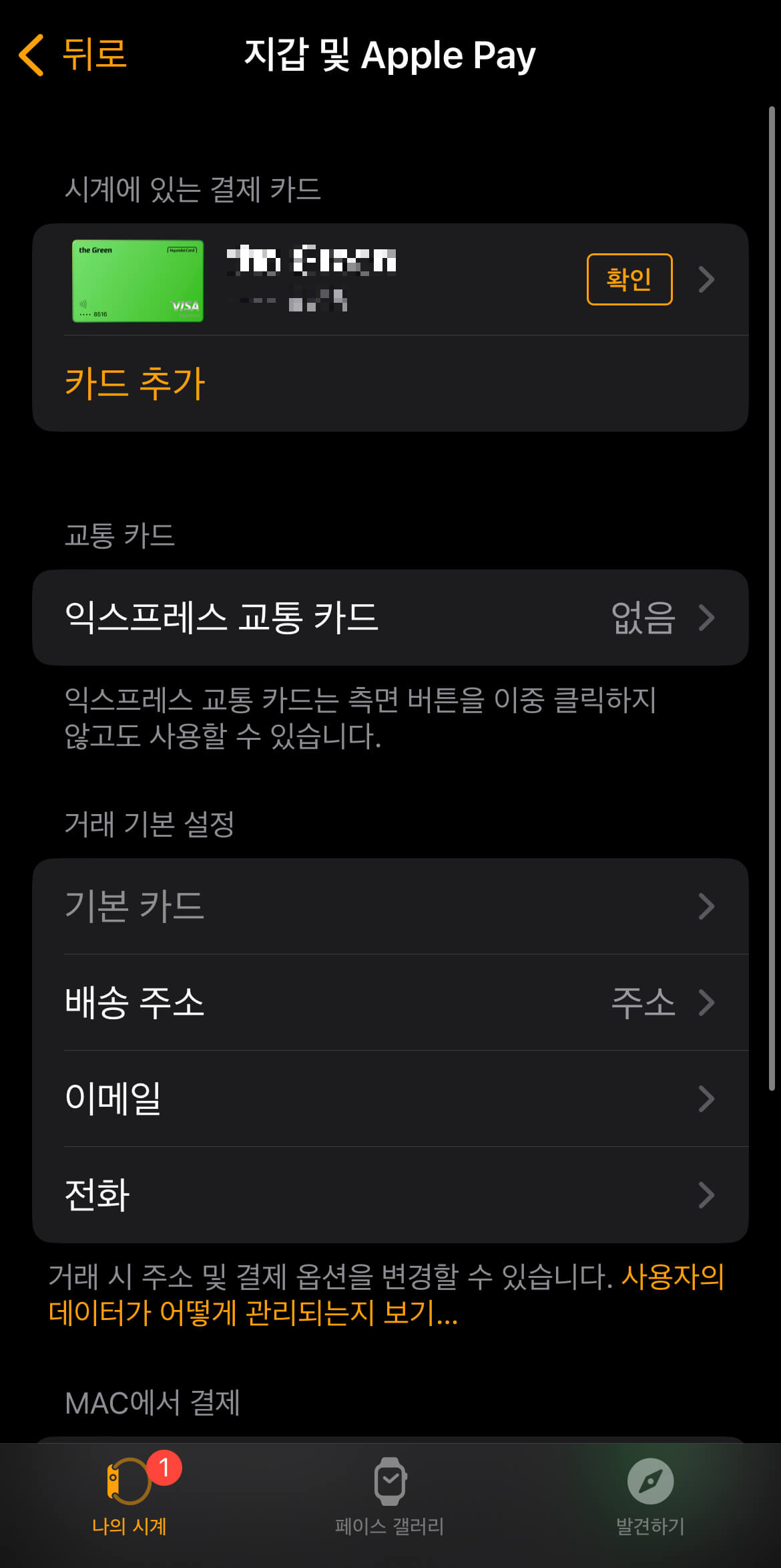 애플워치에서 CVC 번호를 넣어주신 후 아이폰에서 애플워치 앱을 열어줍니다. 아이폰의 애플워치 앱에서 [지갑 및 Apple Pay]를 선택한 후, 시계에 있는 결제 카드 오른쪽에 [확인]을 눌러주면 간단하게 끝납니다. 아래와 같이 카드 확인이 되었고 이제 애플워치를 사용하여 애플페이로 결제할 수 있습니다.