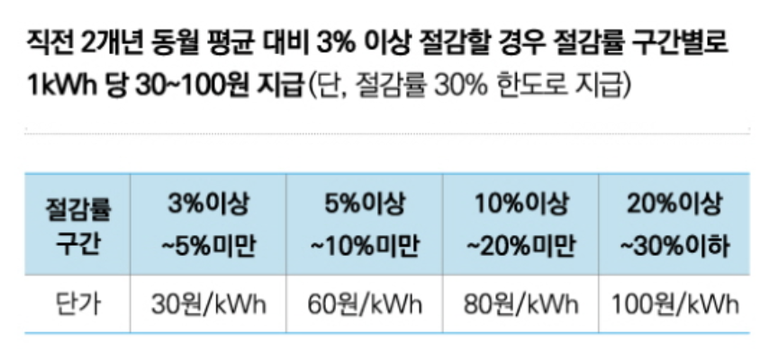 에너지캐시백은 절감율에 따라 차등지급 되는데요. 평소 내가 사용하는 전력양을 자주 확인하시는 분들이라면 위의 표를 보시고 절감량을 확인하시면 좋을 것 같습니다.