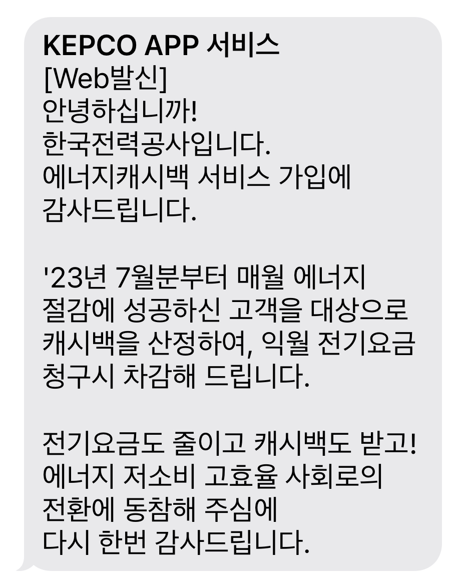 에너지캐시백은 현금으로도 지급이 가능했었는데, 관리의 편의를 위하여 23년 하반기부터는 전기요금에서 감면되는 방식으로만 캐시백이 된다고 합니다. 전기요금에서 감면이 바로 되어 전기요금이 청구되는 경우에는 생활요금이 줄어들었다는 체감이 잘 되지 않을 수도 있지만 그래도 전기요금을 조금이나마 절약할 수 있는 방법이 아닌가 싶습니다.