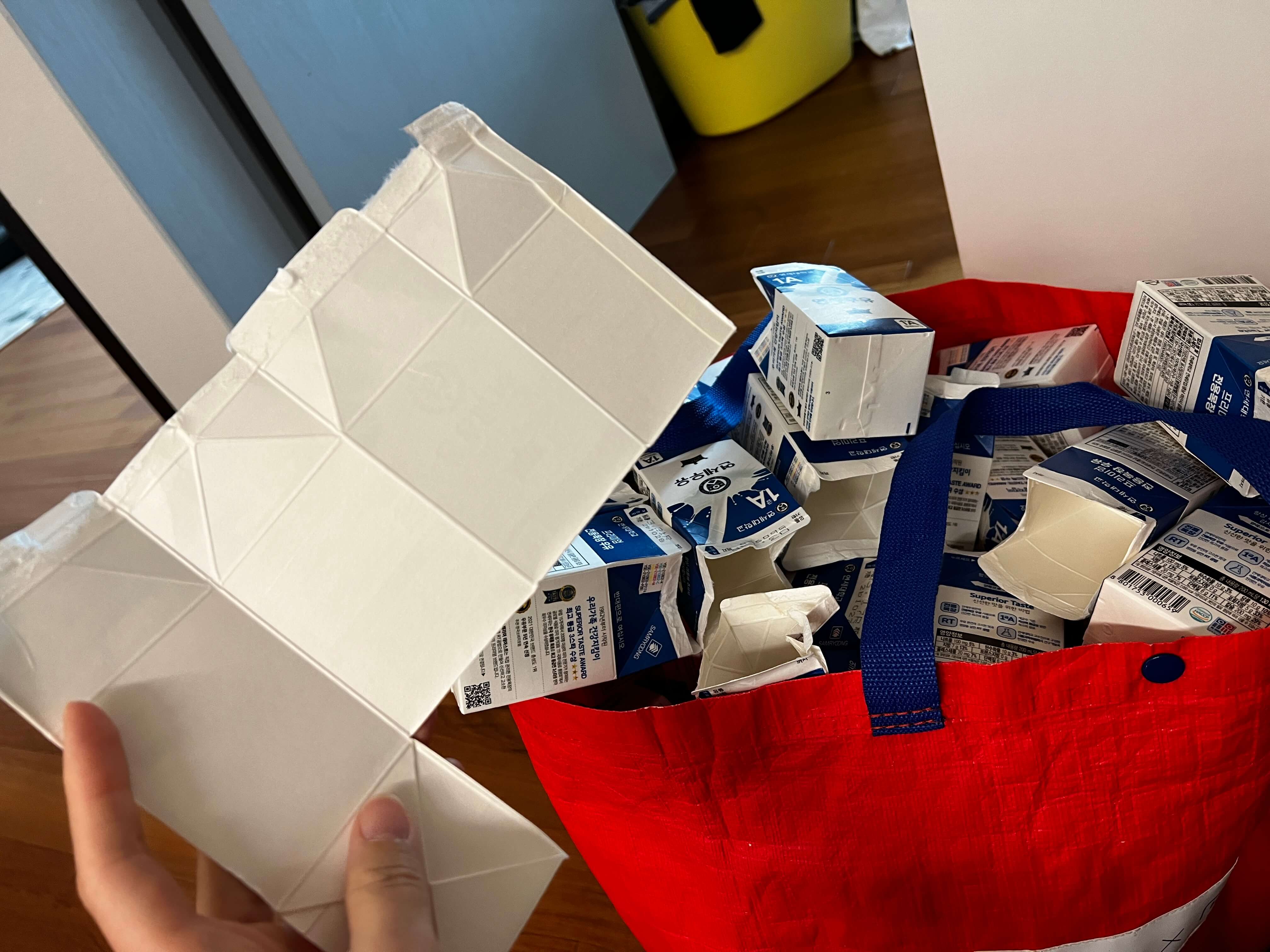일단 우유팩은 분리수거를 위해 따로 모아줍니다. 따로 모은 우유팩은 깨끗이 씻어 말려두었죠. 매번 씻고 말리는 과정이 사실 매우 귀찮습니다만 의외로(?) 제 안에는 환경을 생각하는 유전자가 있는지 아무튼 별생각 없이 우유팩을 모아두었던 것이 저렇게 많아졌어요. 말린 우유팩은 커다란 장바구니에 모아뒀다가 한꺼번에 자르는 작업을 합니다. 아무 생각 없이 자르다 보면 100개 정도는 그냥 자르게 됩니다.