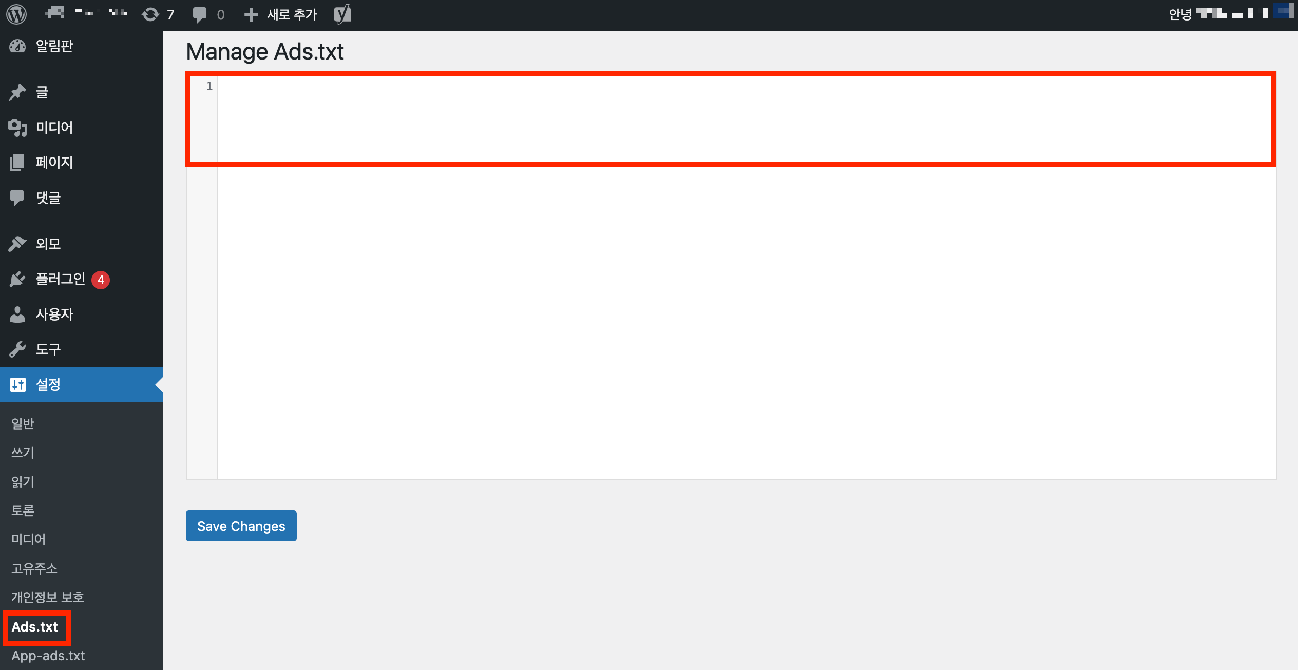 설치 후, 관리자 페이지 왼쪽 설정에 들어가면 방금 설치한 Manage Ads.txt 플러그인이 보입니다. 클릭하시면 오른쪽과 같은 화면이 나오는데, 간단히 애드센스에서 복사하신 ads.txt를 빨간색 칸 안에 붙여 넣기 하시고 하단에 [저장]을 누르시면 문제가 해결됩니다.