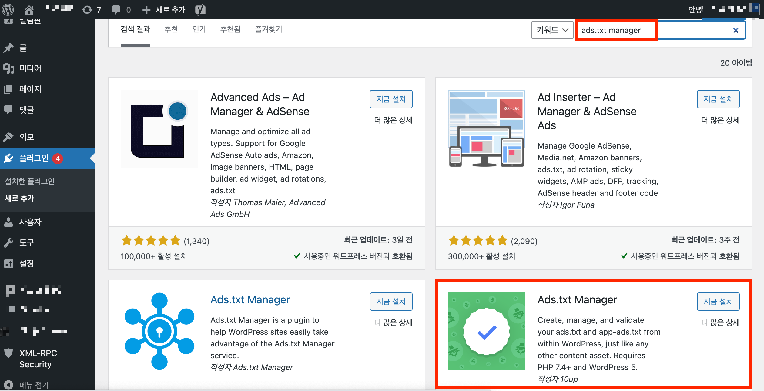 워드프레스는 모든 것이 플러그인으로 해결 가능하기 때문에 오히려 티스토리보다 쉬운 것 같기도 합니다. 이번에도 문제를 해결하기 위해 플러그인에 들어가서 검색을 해 봅니다. ads.txt를 넣어야 하기 때문에 검색창에 ads.txt manager라고 검색을 한 후, 가장 많이 다운받은 플러그인으로 설치를 해 주었습니다. 어떤 것을 설치해도 상관은 없는 것 같아요.