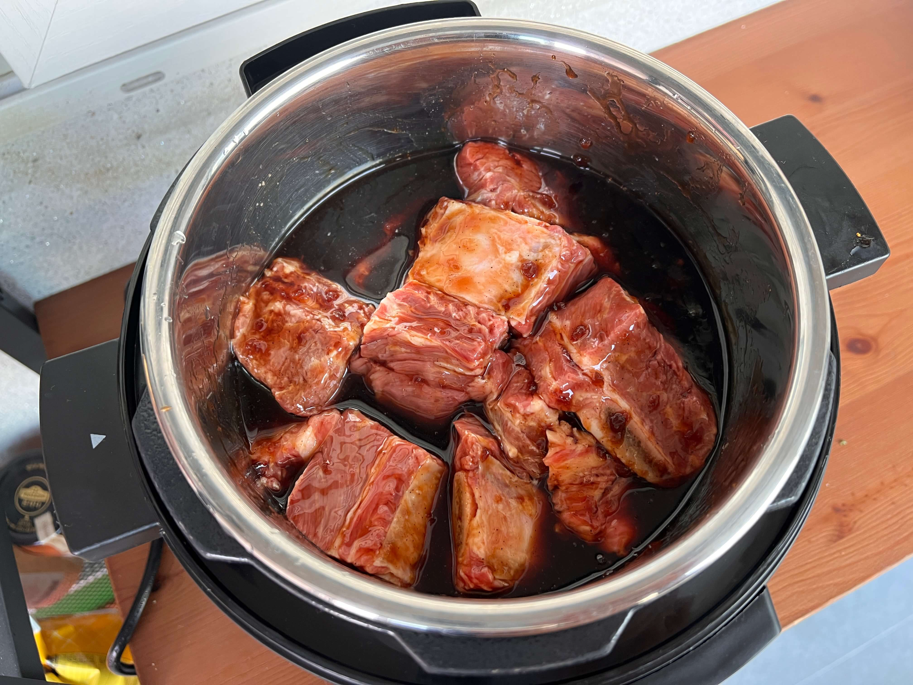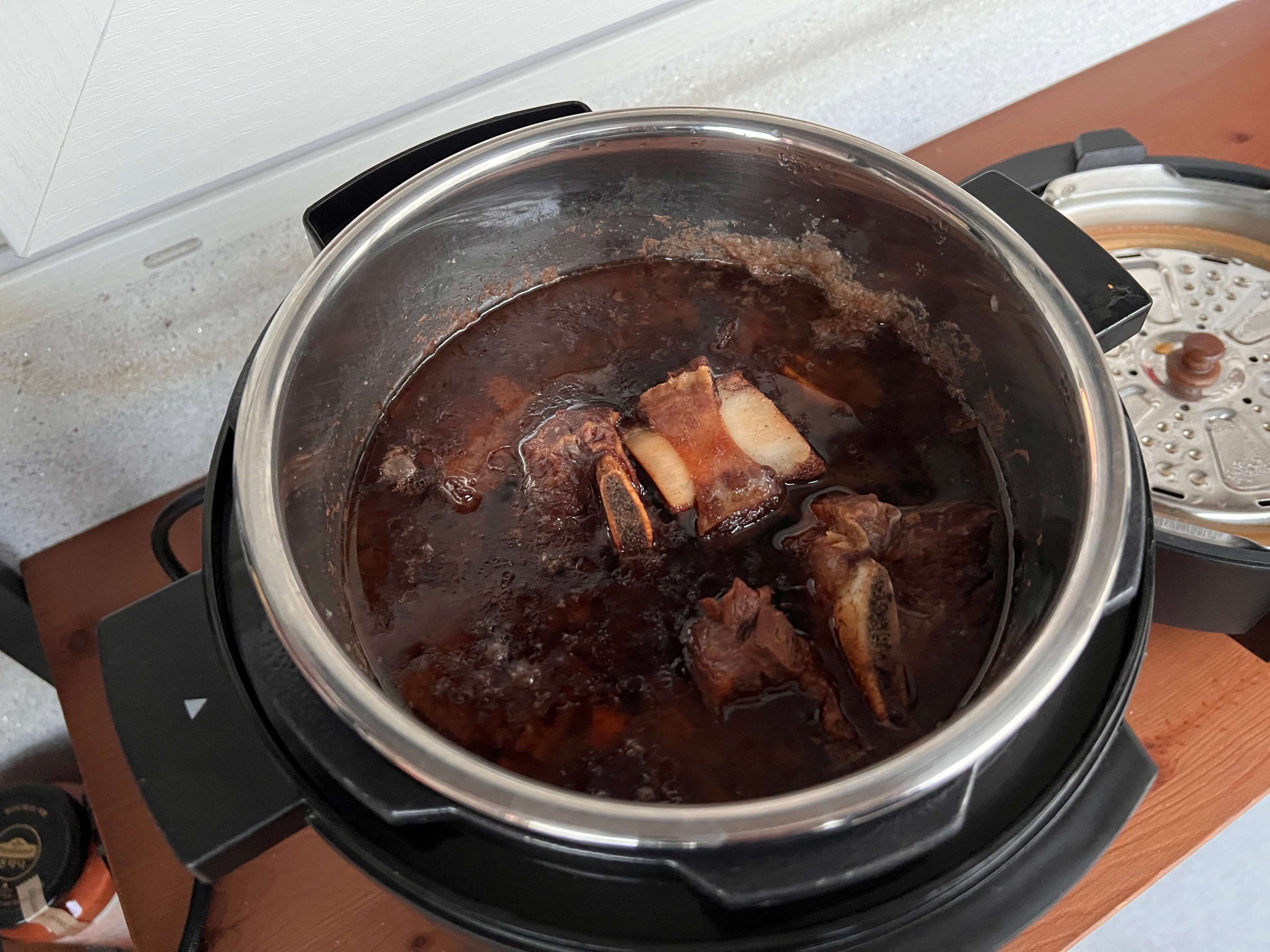 양념만 넣어주었던 갈비에서 국물이 나와 국처럼 되었지만 갈비찜이 잘 완성되었습니다. 갈비찜에 원래는 다른 야채 종류도 종종 넣는데, 이날은 별 다른 야채 없이 갈비만 넣고 갈비찜을 해 주었네요. 위에 둥둥 뜬 것은 갈비에서 나온 기름이기 때문에 시간이 되신다면 내솥만 빼서 잠시 찬곳에 식혀 기름이 굳으면 떠내시면 됩니다.