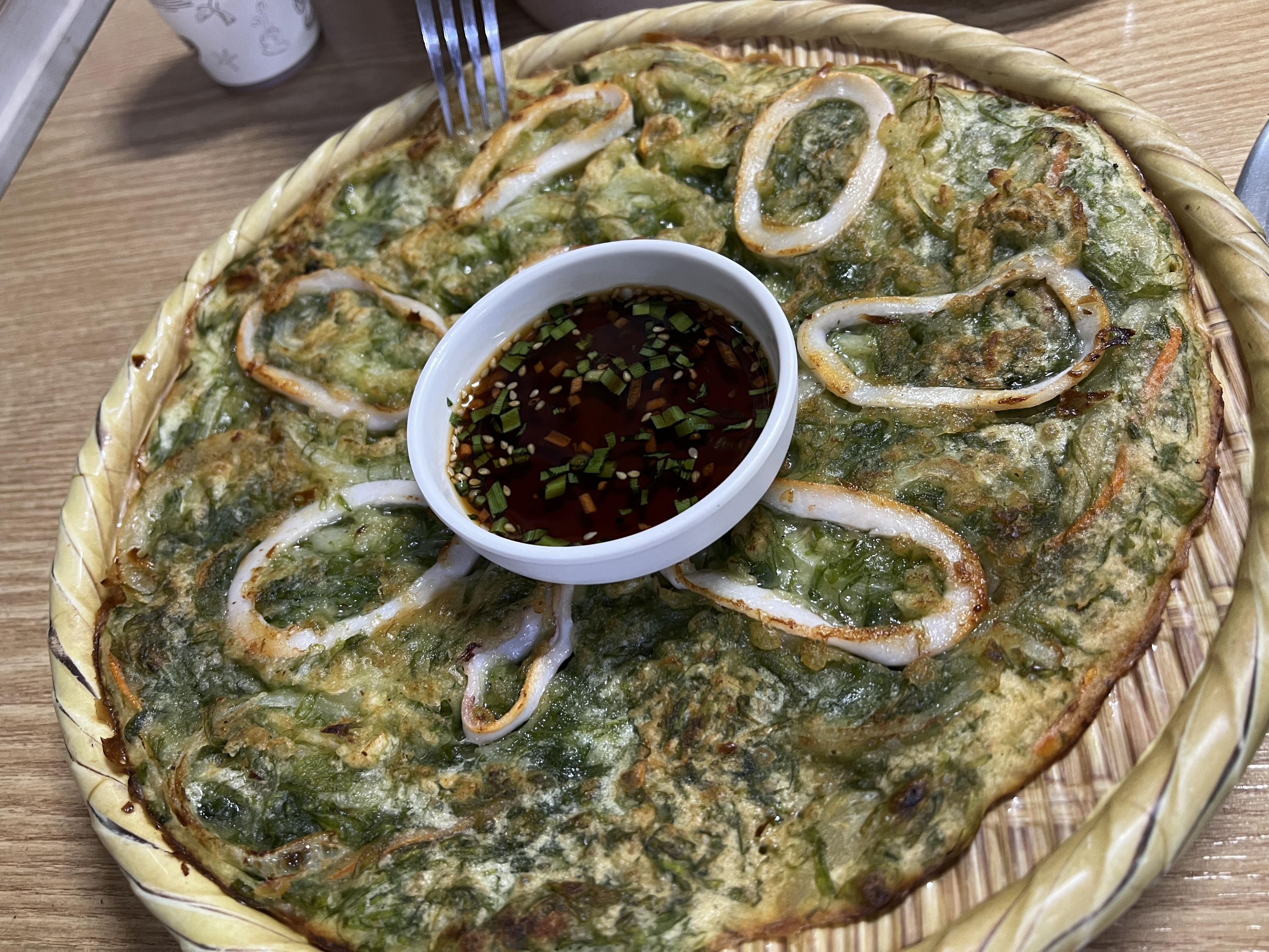 늘 갈 때마다 전도 하나씩 시키곤 하는데요. 따뜻하고 바삭한 전을 먹는 재미도 있어서 아이들이 참 좋아하더라고요. 물론 위에 얹어진 오징어를 쏙쏙 빼먹는 재미로 파래 전을 집어먹지만요 ㅎㅎ