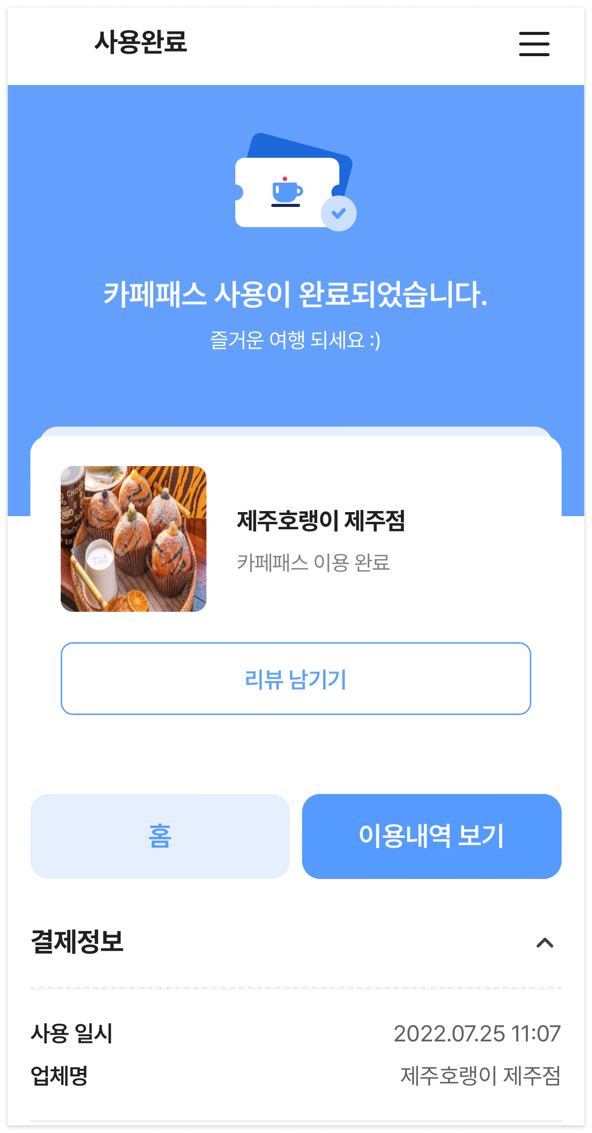 카페 이름을 클릭하여 들어가면 저렇게 카페패스 사용 버튼이 나옵니다. 저 상태로 점원에게 보여드리면 점포코드를 입력하고 맛있는 커피를 줍니다. 저는 이미 사용한 후라 사용완료라고 나오네요. 처음으로 간 제주호랭이 제주점에 점원분이 너무 친절하게 사용방법도 잘 알려주셨어요. 아아도 너무 맛있고 공항과 가장 가까운 카페패스 사용 지점이라 제주호랭이 제주점을 카페패스 첫 지점으로 선택하셔도 좋을 것 같습니다.