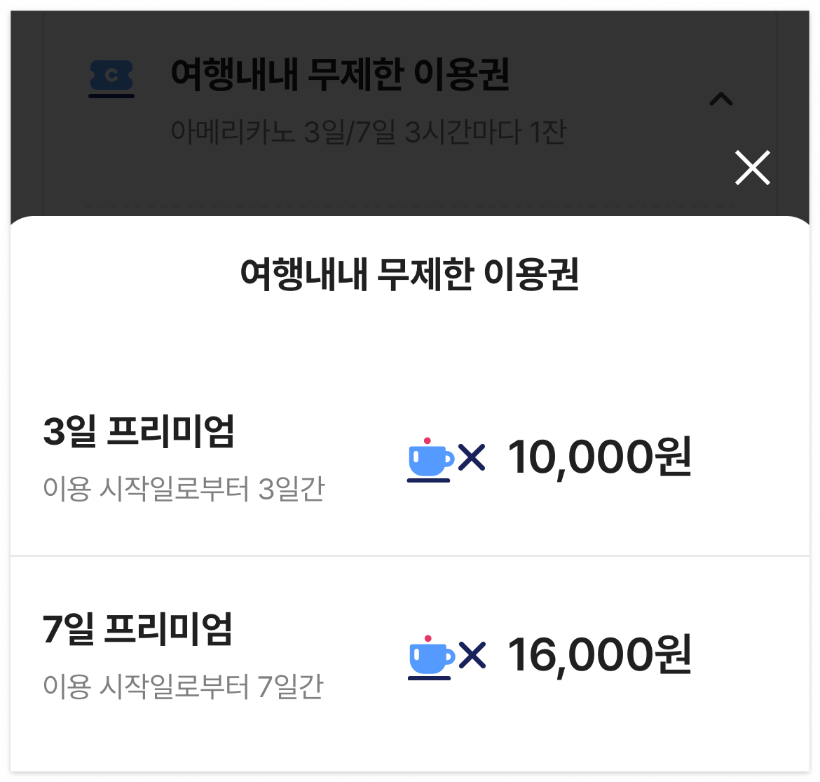 3시간마다 커피 수혈이 가능한 여행 내내무제한 이용권은 3일 또는 7일권으로 끊을 수 있습니다. 일단 아메리카노만 이용할 수 있는데, 추가금액을 지불하면 다른 종류로도 구매가 가능합니다(차감액은 2000원입니다). 저는 어차피 2주간 제주도에 머무를 예정이니 7일 프리미엄권을 끊어보기로 합니다.