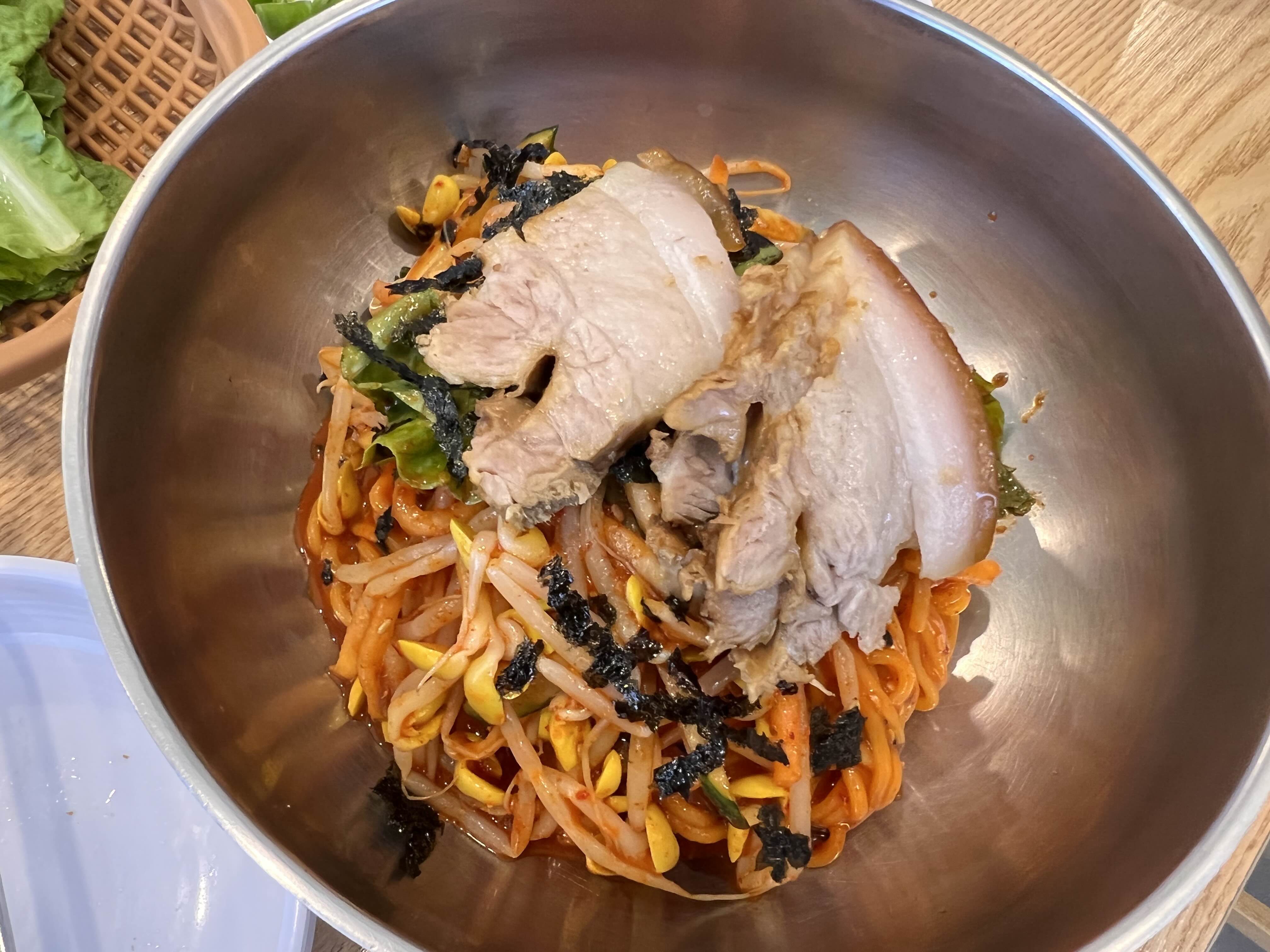 고기를 해치운지 한참이 지나서야 국수가 나옵니다. 고기국수 2개에 비빔국수 1개를 주문해보았는데, 고기국수는 아이들이 각 1그릇씩 놓고 먹었습니다. 아직 초등학생인데도 먹는 것을 보면 가끔 성인만큼 먹는다 싶은 느낌이 듭니다. 비빔국수는 삼대국수와 비슷한 느낌이었는데, 고기국수의 국물은 자매국수가 더 제 입맛에 맞았습니다. 아이들도 먹은 국수 중에 가장 맛있었다고 했었구요.
