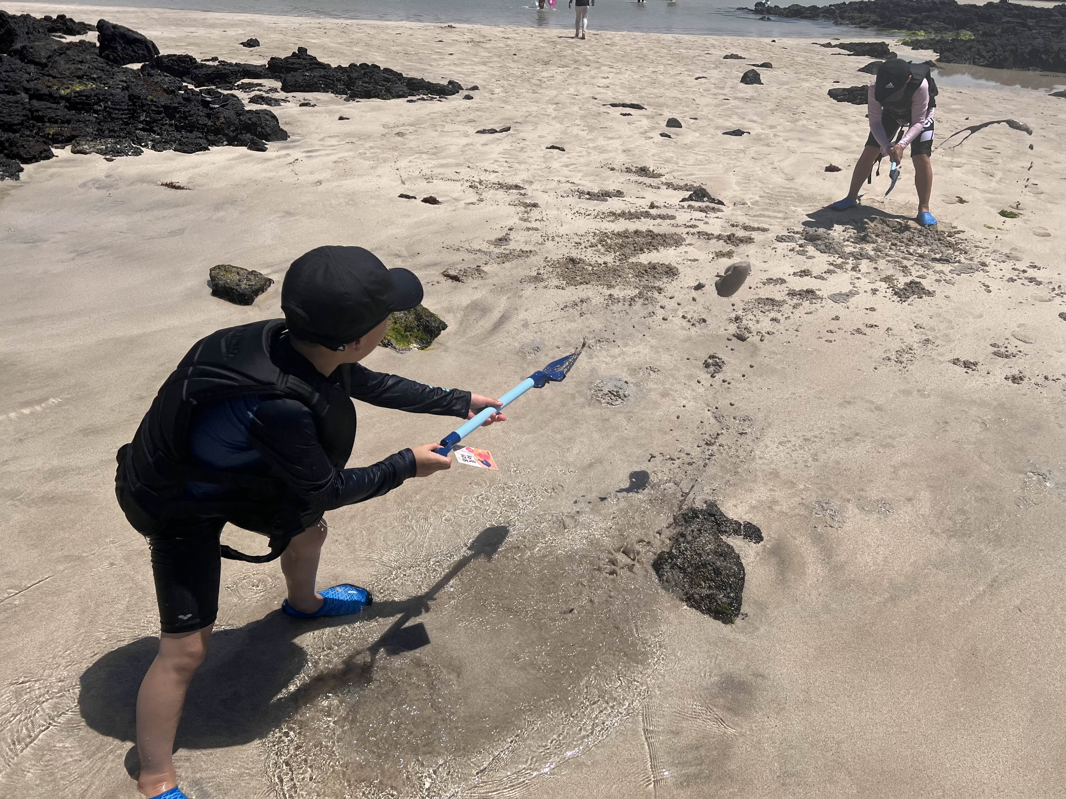 바다에 가자고 난리난리인 아이들을 위해 가장 가까운 함덕해수욕장으로 자리를 옮겨보았습니다. 날씨도 좋은데 썰물 때라 저 멀리까지 나가서 놀 수 있었어요. 바다생물도 많아서 아이들이 이것저것 잡고 놀기도 하고, 가져온 다이소 득템 물건인 삽을 이용해서 모래를 파기도 하고, 한 3시간은 놀았던 것 같아요.