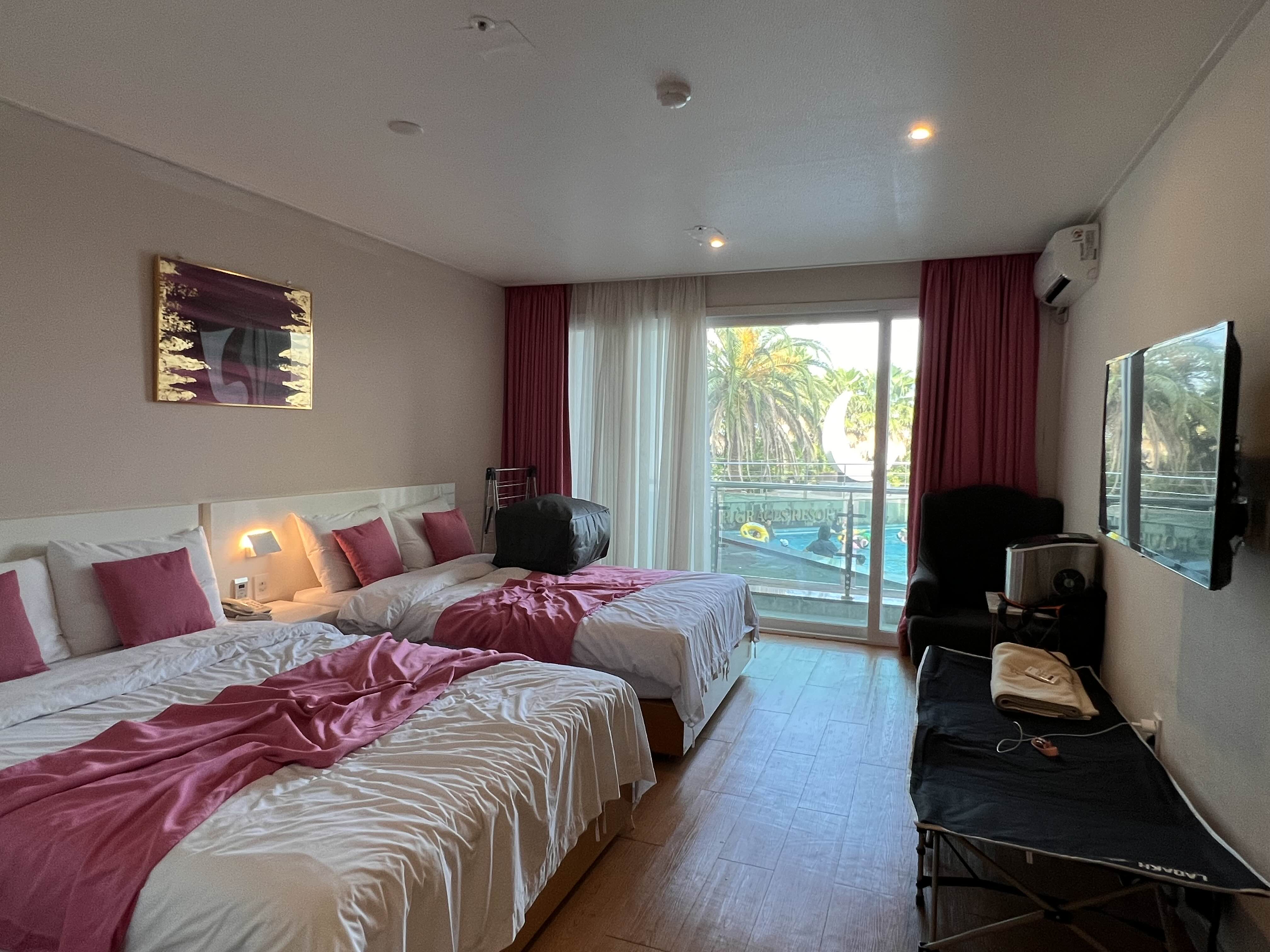 룸 컨디션은 그럭저럭 괜찮습니다. 화장실도 적당히 크고, 저희가 묵은 방은 수영장이 바로 보이는 곳에 위치해서 아이들은 수영하러 뛰어나가고 저는 방 안에서시원하게 에어컨 켜고 편히 일도 하고 업무도 보고 방 정리도 하고 아이들도 지켜볼 수 있습니다. 수영장은 유아풀과 성인풀이 나뉘어 있는데, 유아풀에는 작은 배도 떠 있습니다. 아주 어린 아가들은 탈 수 있을 것 같은데, 저희 초1은 한번 타보더니 물이 샌다(?)고 하더라고요.성인풀은 130cm부터 이용 가능이라고 되어 있는데 지금 120cm가 조금 넘는 초1이 들어가니 넉넉하게 잘 놉니다.