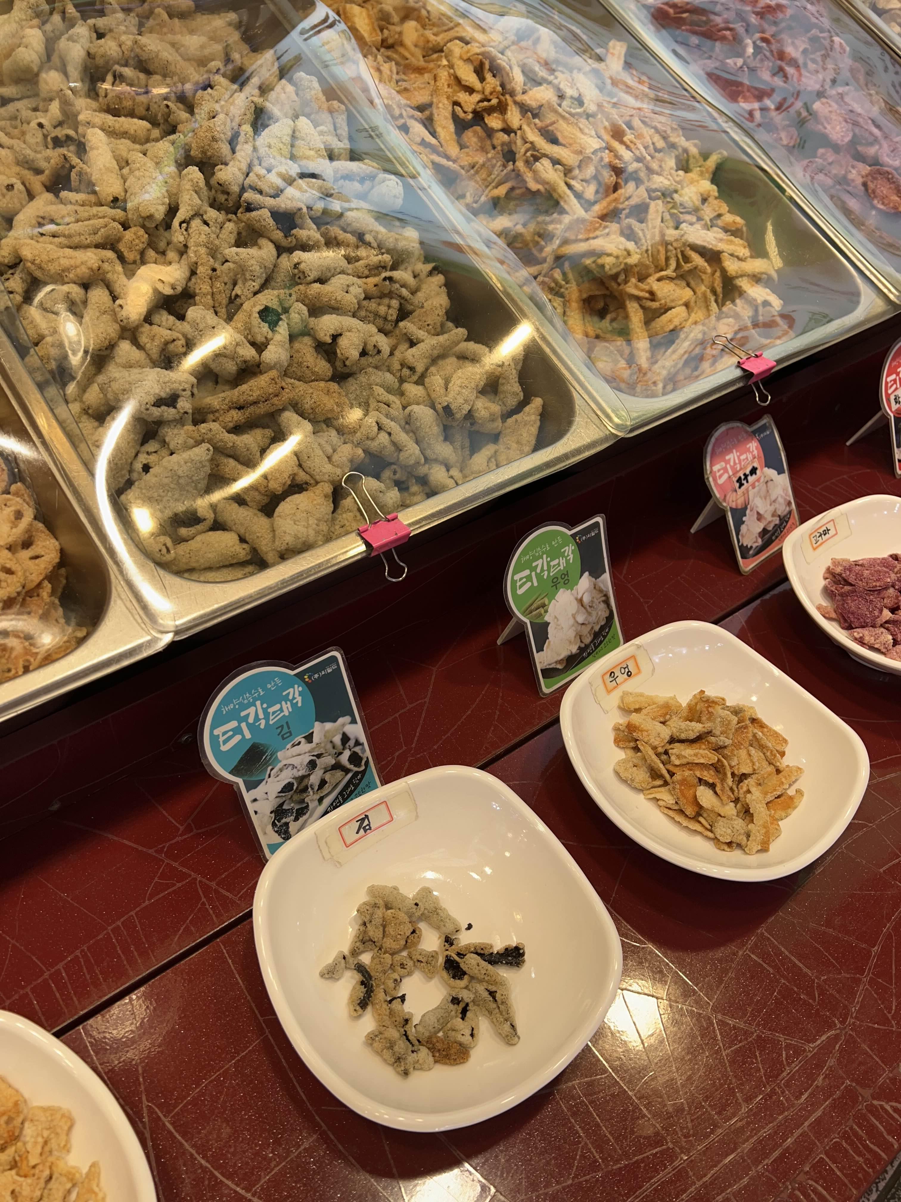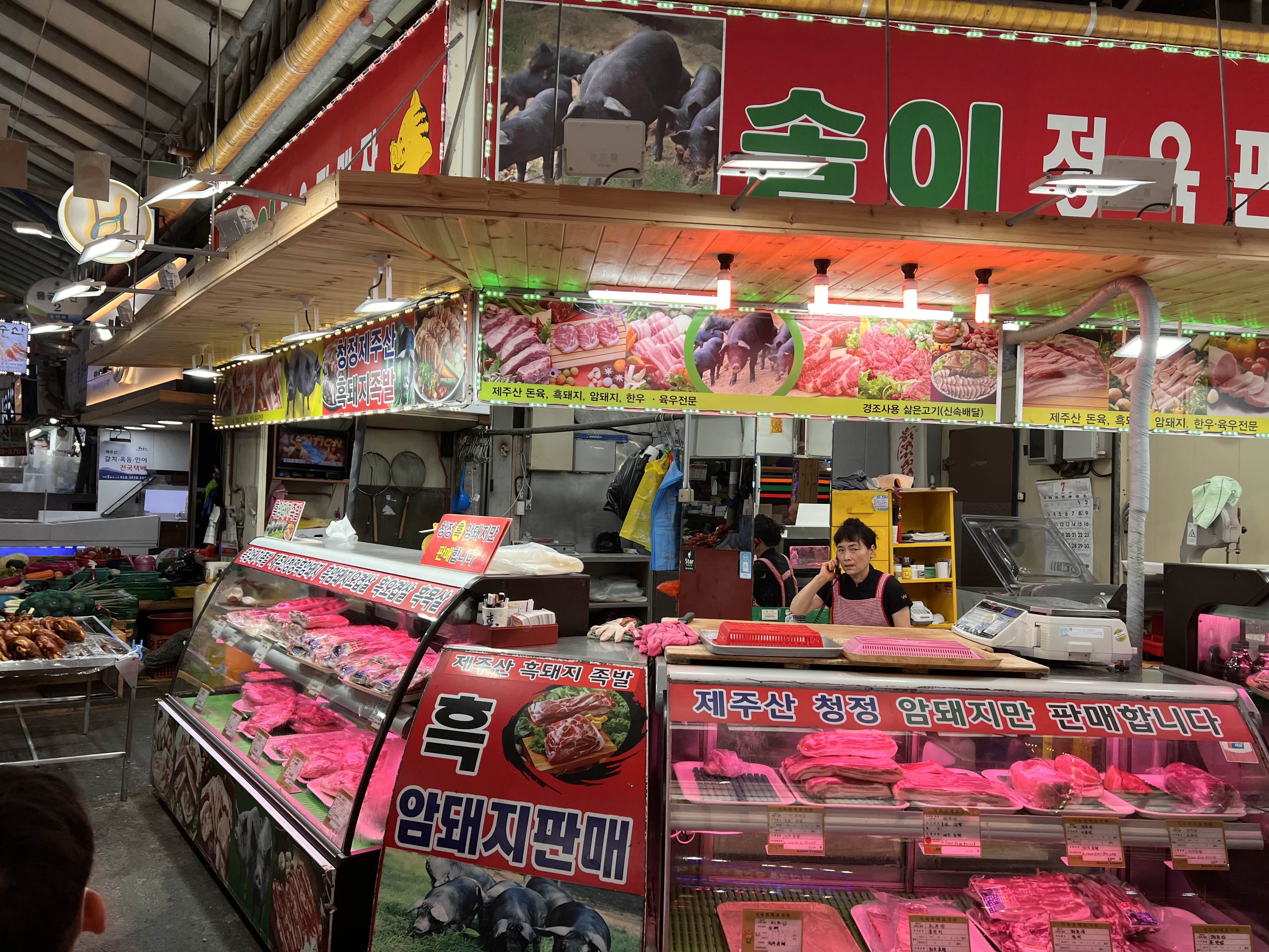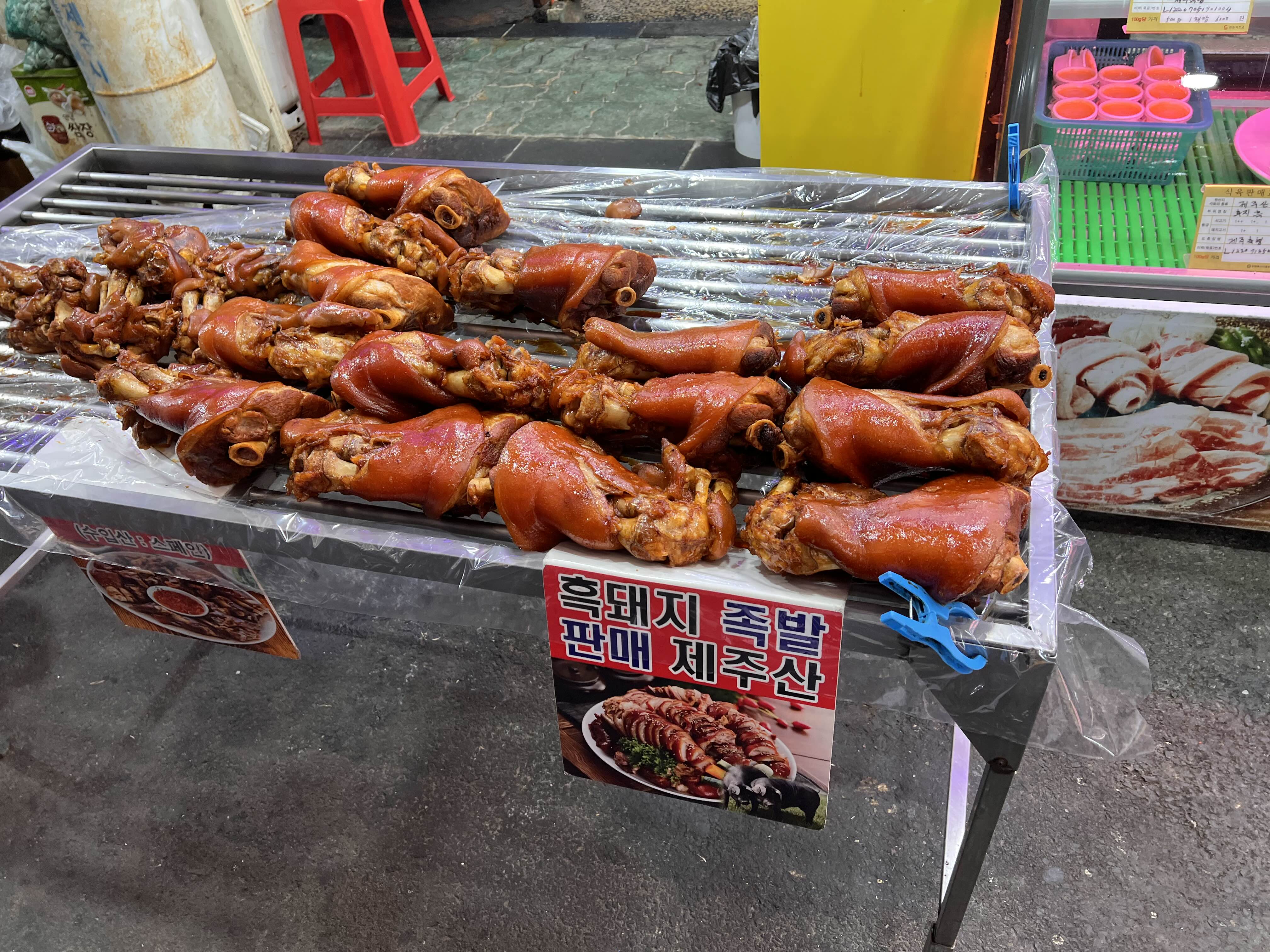 아침을 그렇게 먹었는데도 뭔가 먹고 싶은 아이들을 위해 먹거리를 사러 동문시장에 들렀습니다. 제주도에 올 때마다 늘 오는 곳이고 늘 같은 것만 사기 때문에 머무는 시간은 얼마 걸리지 않았네요. 초입부터 이것저것 맛있어 보이는 먹거리를 많이 판매하는데, 저희 아이들은 제주도 흑돼지로 만든 족발을 제일 좋아하기에 정육점에서 족발을 구매했어요. 앞다리 1개에 20,000원입니다. 부각을 특히 둘째가 좋아하여 부각도 1 봉지 샀고요.