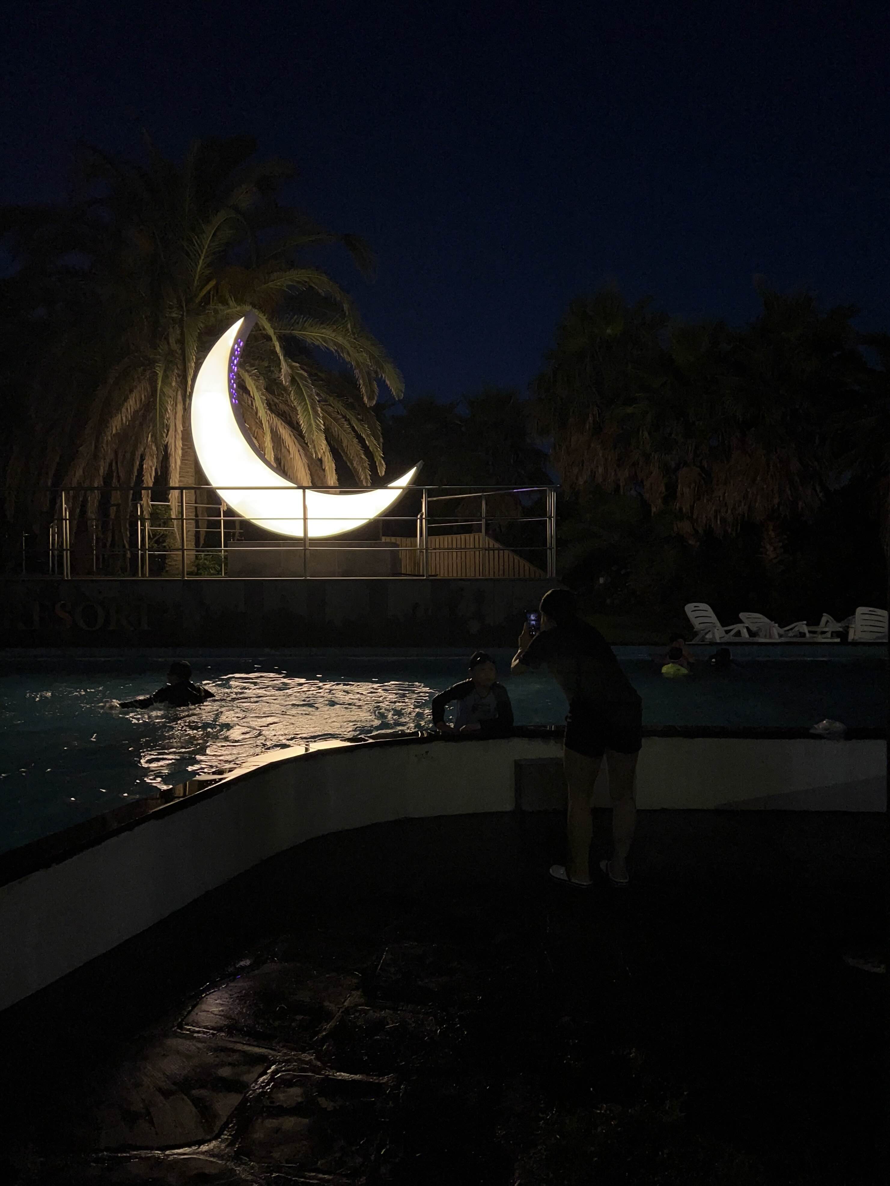 밤이 되면 이렇게 수영장 가운데 큰 달이 뜹니다. 너무 예뻐서 한 장 찍어보았는데, 그새 아이들은 또 수영하러 나가자고 성화여서 수영을 하게 해 주었습니다. 수영장 이용시간이 오전 10시부터 오후 9시까지라 물놀이 좋아하는 아이들은 정말 여기서 실컷 수영하고 놀 수 있답니다.