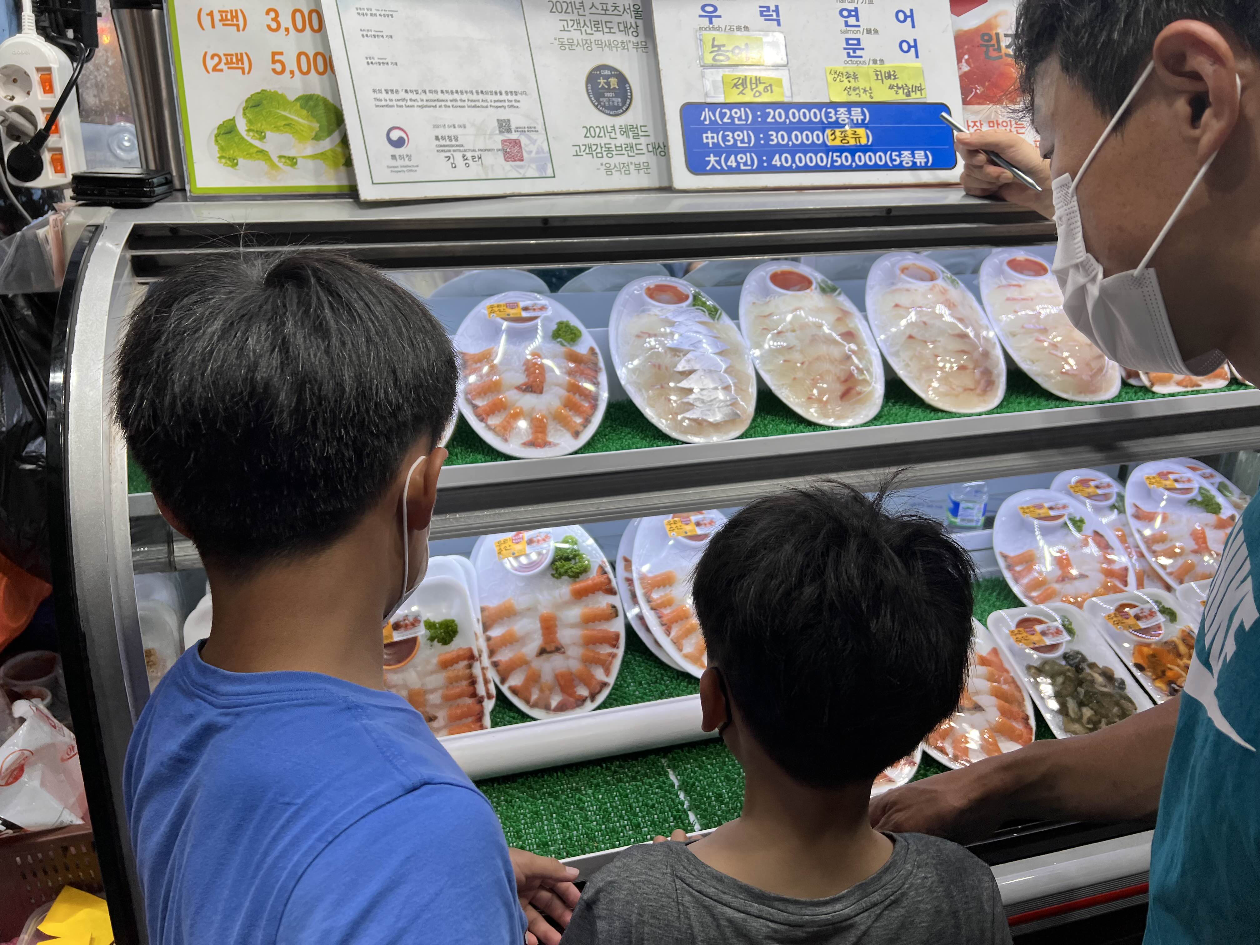 국수를 많이 먹은 것 같은데, 제주도에 왔으니 딱새우를 꼭 먹어야겠다는 둘째님을 위해 숙소로 가는 길에 잠시 들른 동문시장. 화려한 불빛이 새어나오길래 봤더니 동문시장 초입의 먹자골목이 대단합니다. 낮에는 절대 이럴 것이라고 생각도 못했는데, 온갖 불쇼에 먹을 거리를 사러 나온 사람들로 인산인해더라구요. 저희는 아이들이 있어 얼른 딱새우와 카라향 2봉지만 사가지고 숙소로 돌아왔습니다.