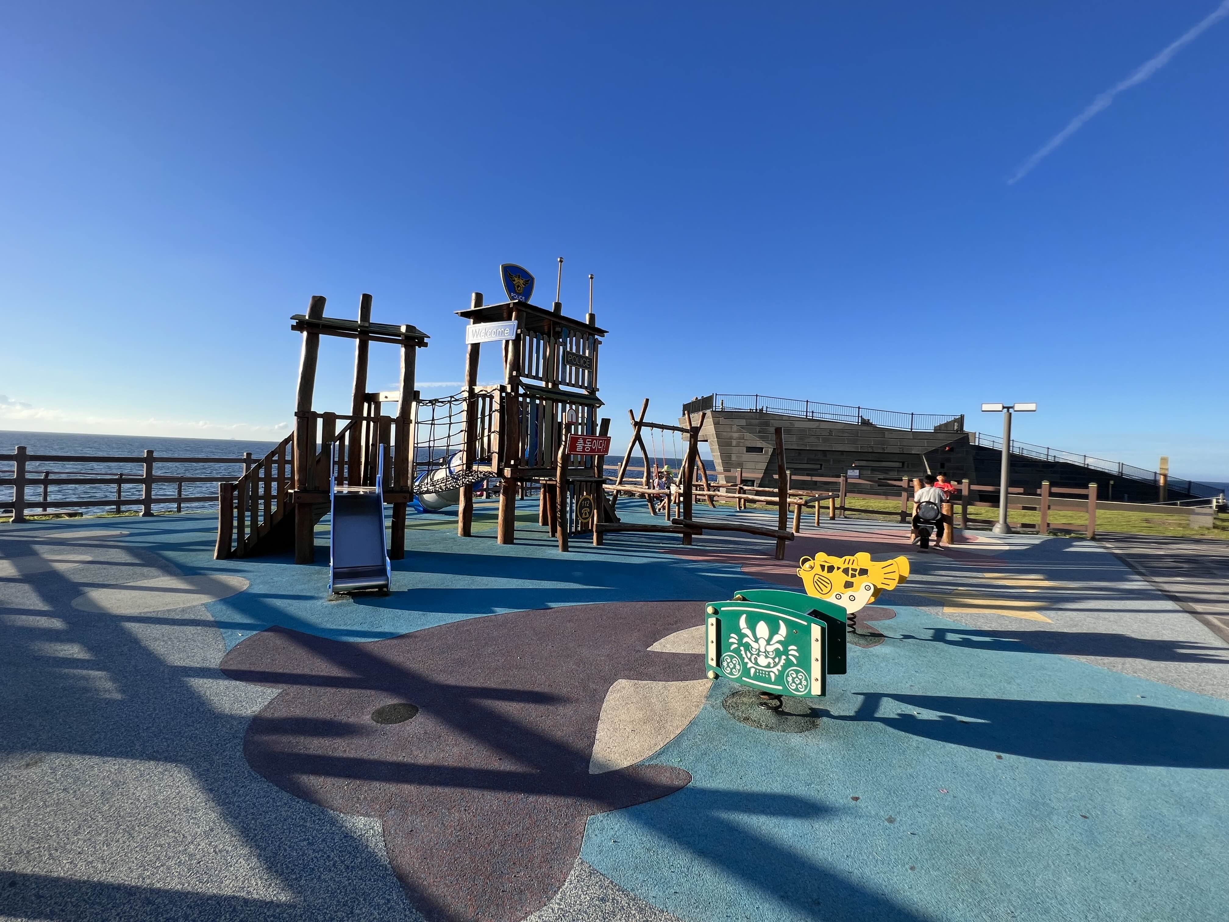 제주도는 길가에 있는 어린이 놀이터 & 공원도 이리 멋집니다. 바닷가를 끼고 이렇게 멋진 놀이터라니, 들르지 아니할 수가 없지 않습니까. 마침 둘째님 화장실이 급하다고 하여 바로 옆에 있는 화장실에 들를 겸, 놀이터에서도 잠시 놀아봅니다.