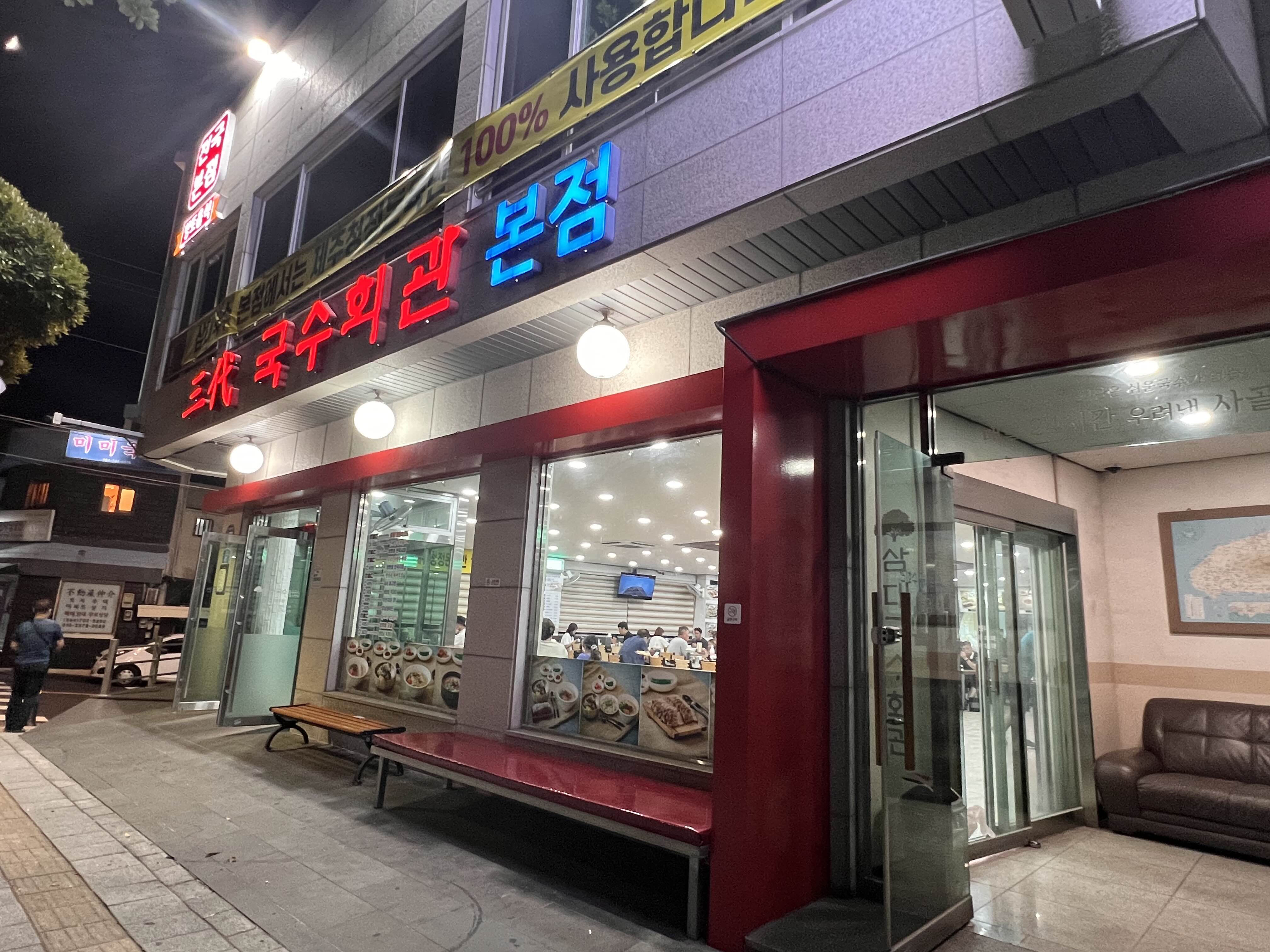 숙소로 돌아와 마침 숙소 근처에 있는 삼대국수집을 찾았습니다. 24시간 영업을 하는 곳인데 유명한 곳이라고 하더라구요. 제주도에 와서 돔베고기와 고기국수를 실컷 먹고싶다는 아이들을 위해 찾은 이 곳에서 저녁을 해결하였습니다. 맛은 솔직히 잘 모르겠어요. 그냥 어디에서나 비슷비슷한 고기국수와 비빔국수의 맛이랄까.
