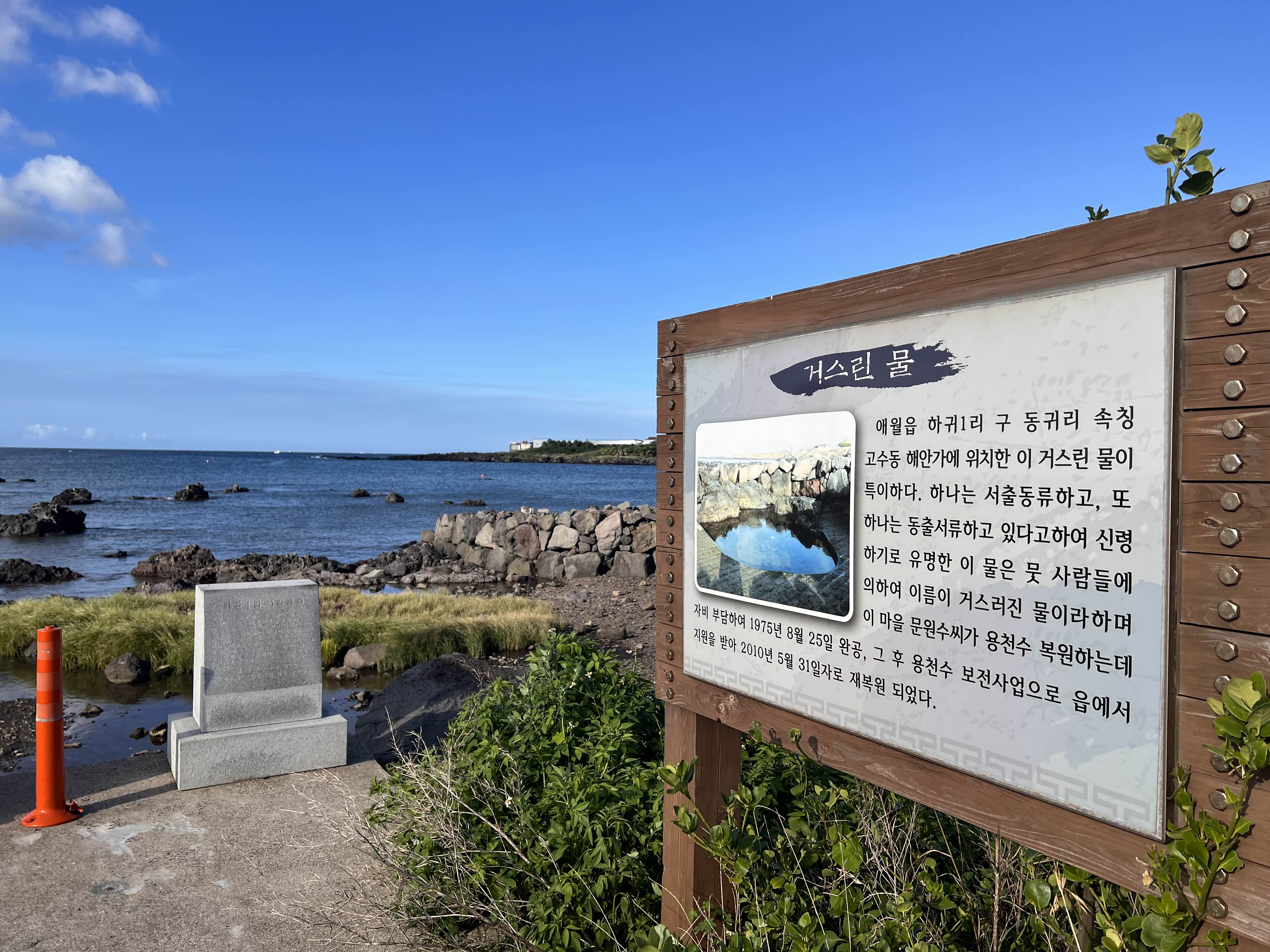 숙소로 오는 길에 배고픔을 이기지 못한 아이들은 라면을 먹자고 조릅니다. 차에 구이바다와 라면, 생수를 항상 싣고 다니기 때문에 적당한 장소를 물색하여 라면끓일 채비를 합니다. 마침 남편이 찾아낸 곳은 한적한 마을 옆길이었는데 '거스린 물'이라는 표지판이 세워져 있더라구요. 제주도에는 곳곳에 이렇게 용천수가 나오는 곳을 정리해놓은 곳이 있습니다. 한적한 곳이라 자리를 잡았는데, 나중에 보니 올레길의 길목인지 사람들이 종종 지나다니더라구요. 라면까지 잘 끓여먹고 다시 숙소로 향해봅니다.