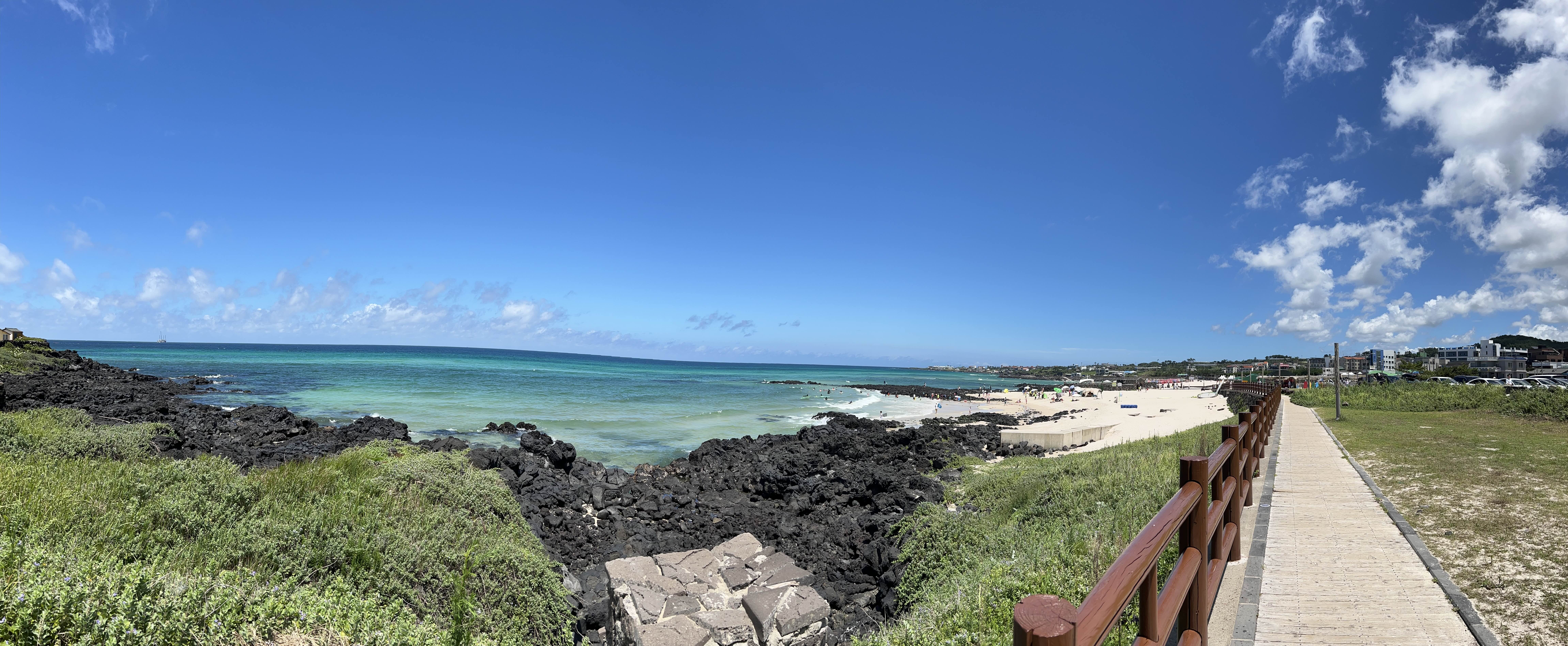 전날 금능해수욕장에서 실컷 놀았다고 생각했는데도 바다를 보면 뛰어들고 싶습니다. 비가 며칠 내린 후라서 그런지 날씨가 한층 더 맑은 느낌입니다. 사진으로 담은 날은 너무 좋은데 실제로 저 길을 걷고 있으면 곧 타버릴 것 같은 느낌이 듭니다. 제주도의 해는 너무 강해서 항상 자외선 차단제나 검정우산을 준비해가시는 것이 좋아요. 저도 항상 우산 쓰고 다녔어요.