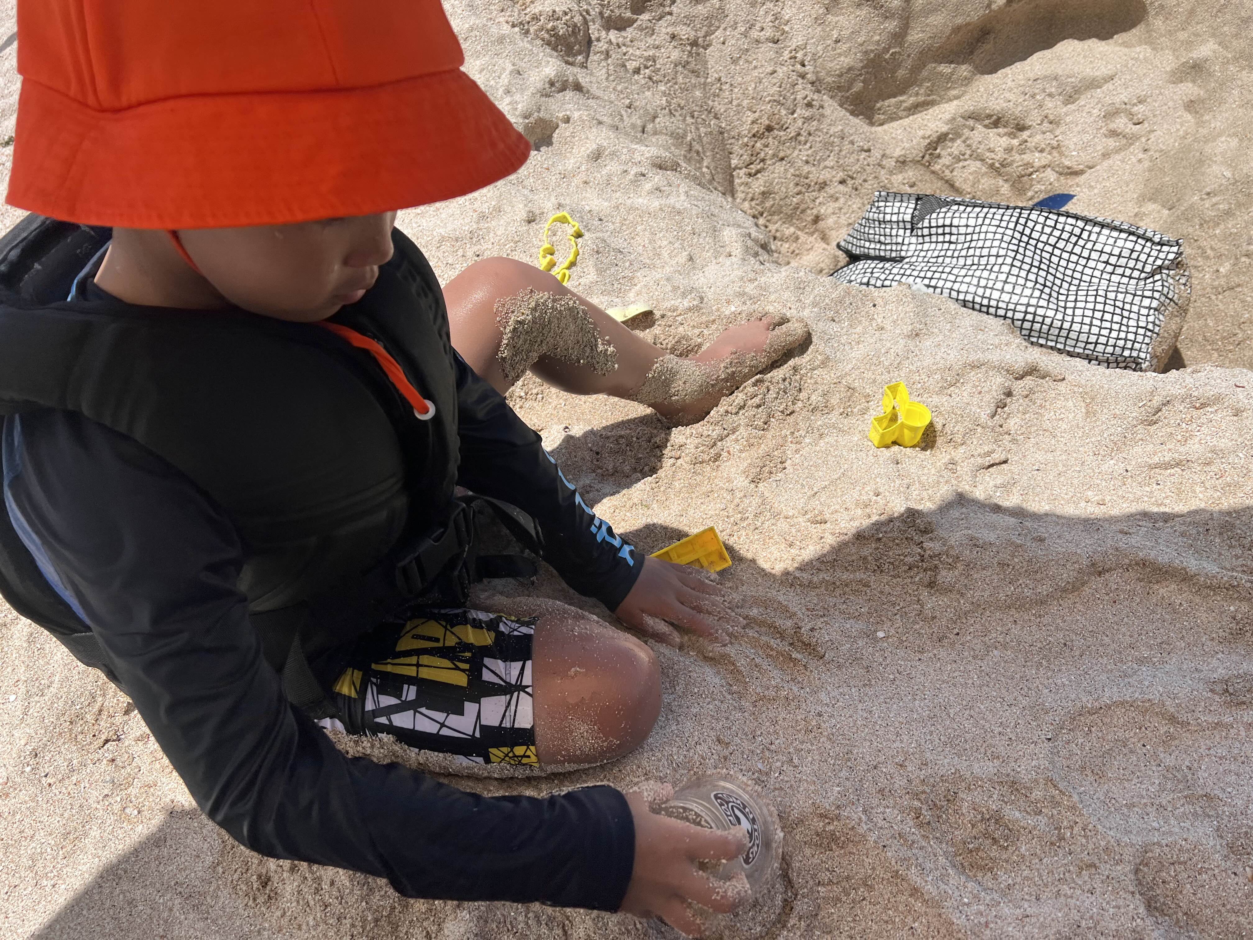 다 컸다고 생각했는데 아직 아가인지 모래놀이를 그렇게 좋아합니다. 시원한 바다에 풍덩 들어갔다가, 예쁜 조개도 하나 잡아와서 엄마 손에 올려주고 모래놀이에 집중합니다. 이날은 날씨가 좋아서인지 사람들이 바닷가에 많이 모여들기 시작했는데, 보통 9시 즈음에는 사람이 별로 없다가 12시~1시 사이에 피크인 것 같아요. 해수욕장에 좋은 자리를 잡으려면 9시쯤에 도착하시면 좋을 것 같습니다.
