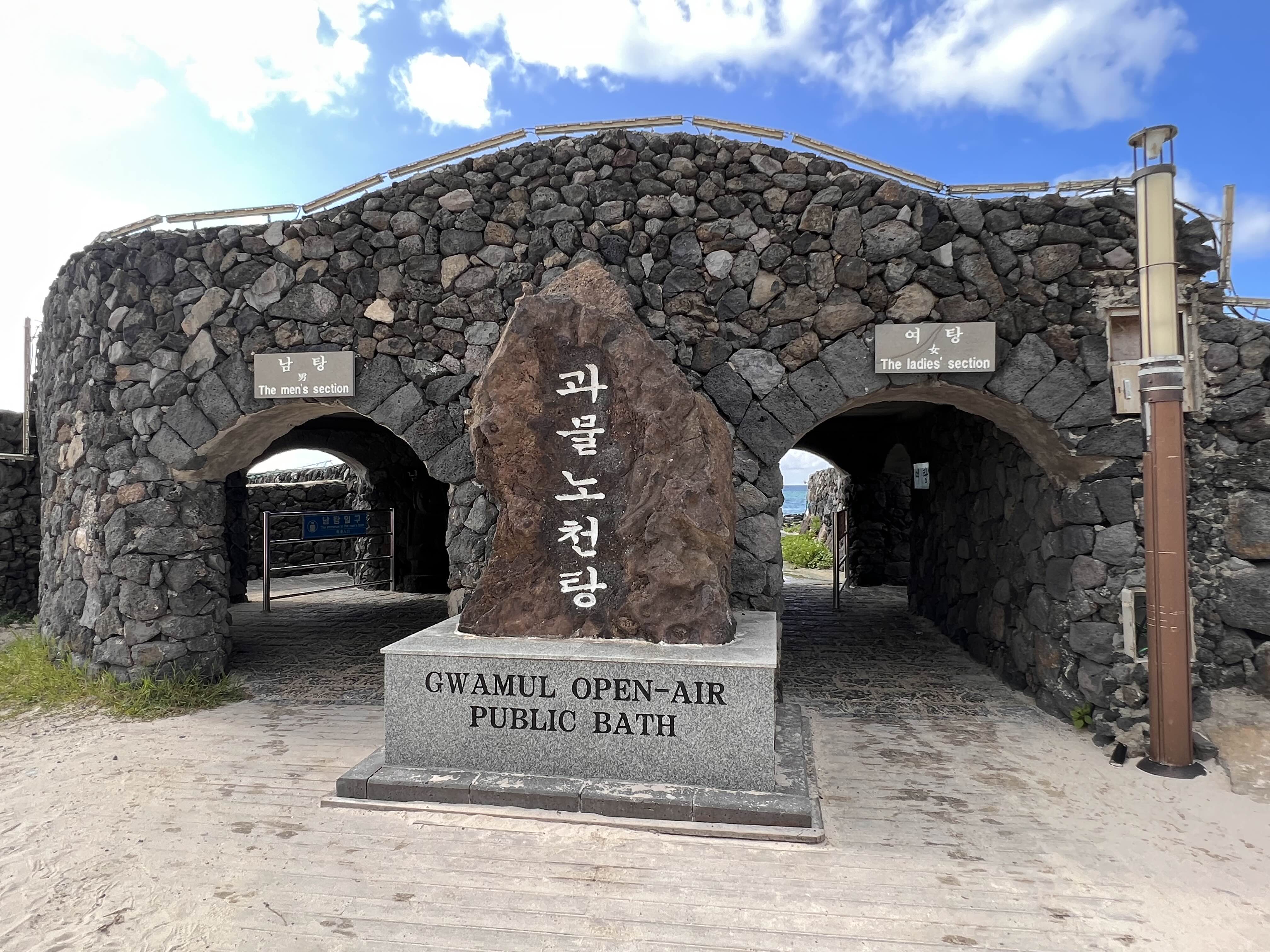 곽지해수욕장의 시그니처라고 할 수 있는 과물노천탕입니다. 여탕과 남탕이 구분되어 있는데, 안에 들어가면 시원한 용천수가 뽕뽕 나오는 목욕탕이 있습니다. 물론 찬물이고 비누나 샴푸를 사용해서는 안됩니다. 보통 해수욕장에 가면 유료로 샤워장을 운영하는데, 여기는 실컷 놀고 와서 용천수료 샤워까지 할 수 있으니 너무 좋죠! 과물노천탕 앞에는 바닥분수도 설치되어 있어 그 앞에 돗자리 깔고 아이들과 많이 놀러오기도 하시더라구요.