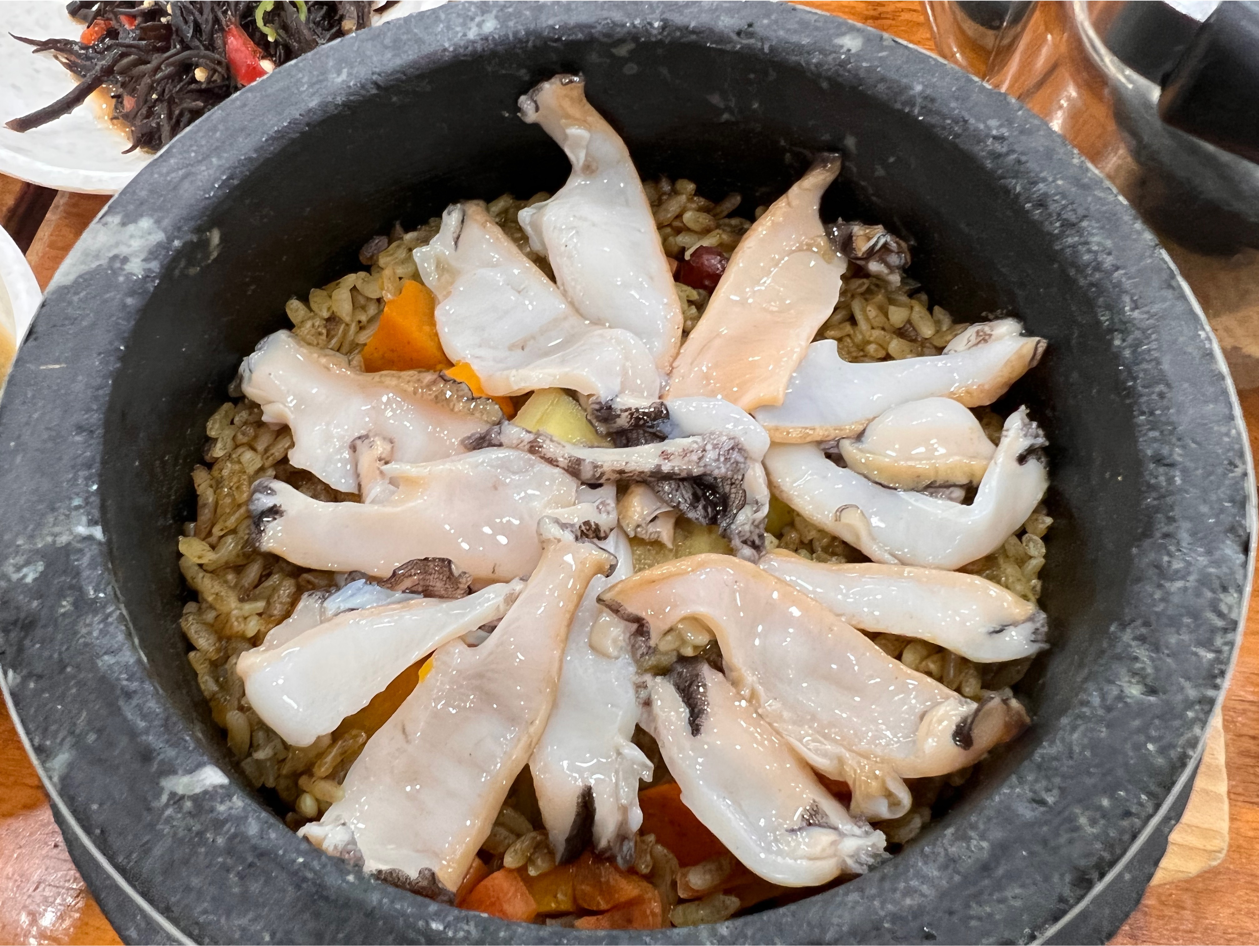 오름을 다녀오니 땀이 비오듯 쏟아지고 허기가 지는 것 같아 밥을 일단 먹어보기로 합니다. 지나가다보니 차가 많이 서 있는 식당이 있었는데 남편 말로는 유명한 곳이라고 하여 들어가보기로 했습니다. 전복요리를 주로 하는 명진전복이라는 곳이었는데 저희는 아침에 전복죽을 먹었기에 전복밥 3인분을 주문하여 넷이 먹었습니다. 맛은 생각보다 너무 짜고 솥밥의 뚜껑을 여는 순간 확 올라오는 비린내가 싫었네요.