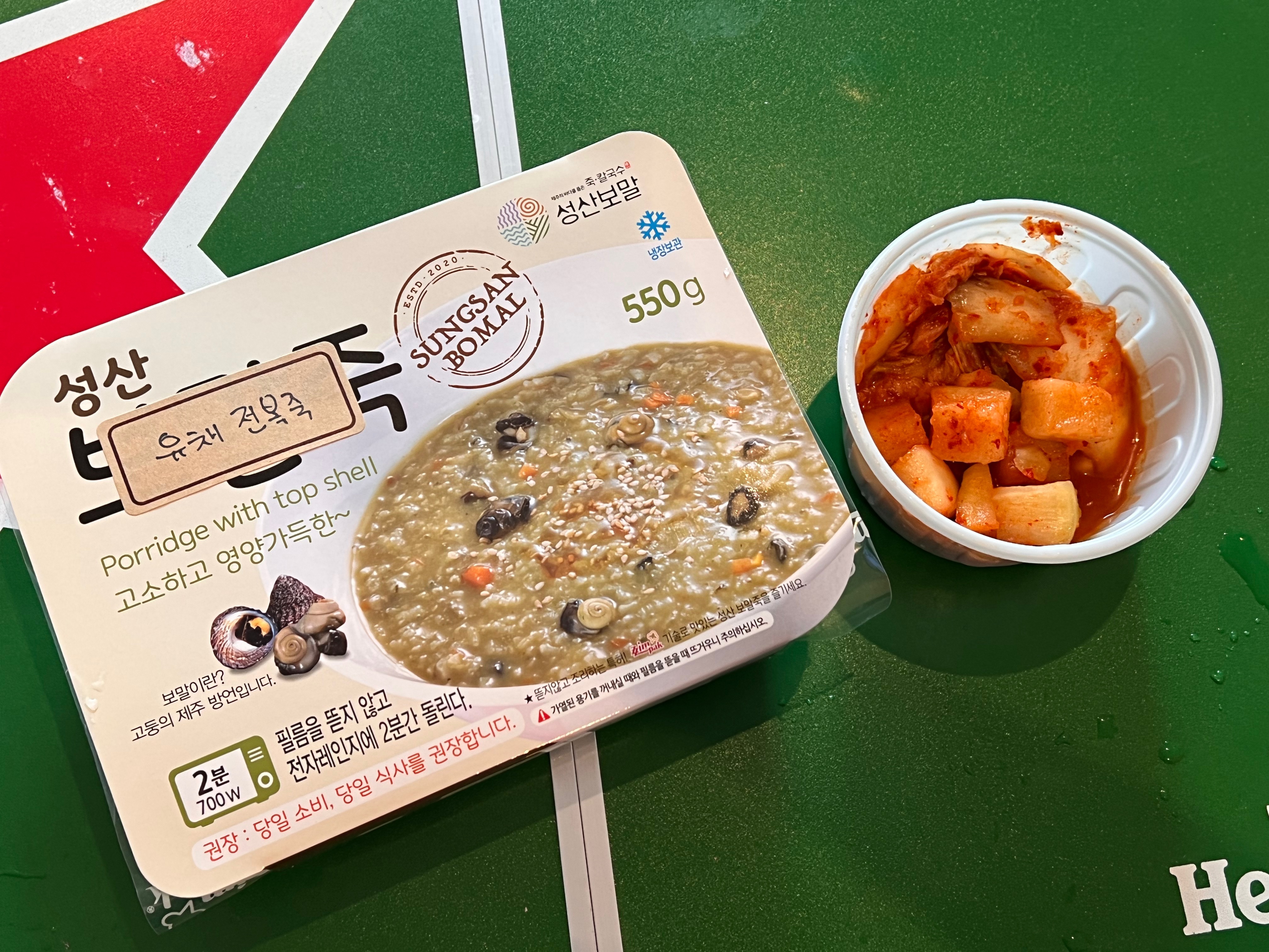 돌아오는 길에 보니 성산보말이라는 죽&칼국수집이 보입니다. 마침 포장도 가능하다고 하여 전복죽 2개를 포장해서 들고왔습니다. 그냥 전복죽인줄 알았는데 가져와보니 유채전복죽입니다. 가격은 1인분에 10,000원으로 본죽보다 가격은 저렴한데 열어보니 전복이 정말 실하고 알차게 들어있네요. 유채가 들어있어 좀 특이하기도 했고, 포장 채로 들고다니다가 전자레인지에 2분만 돌리면 되니 아이들 먹이기에도 참 좋습니다. 맛도 꽤 괜찮더라구요.
