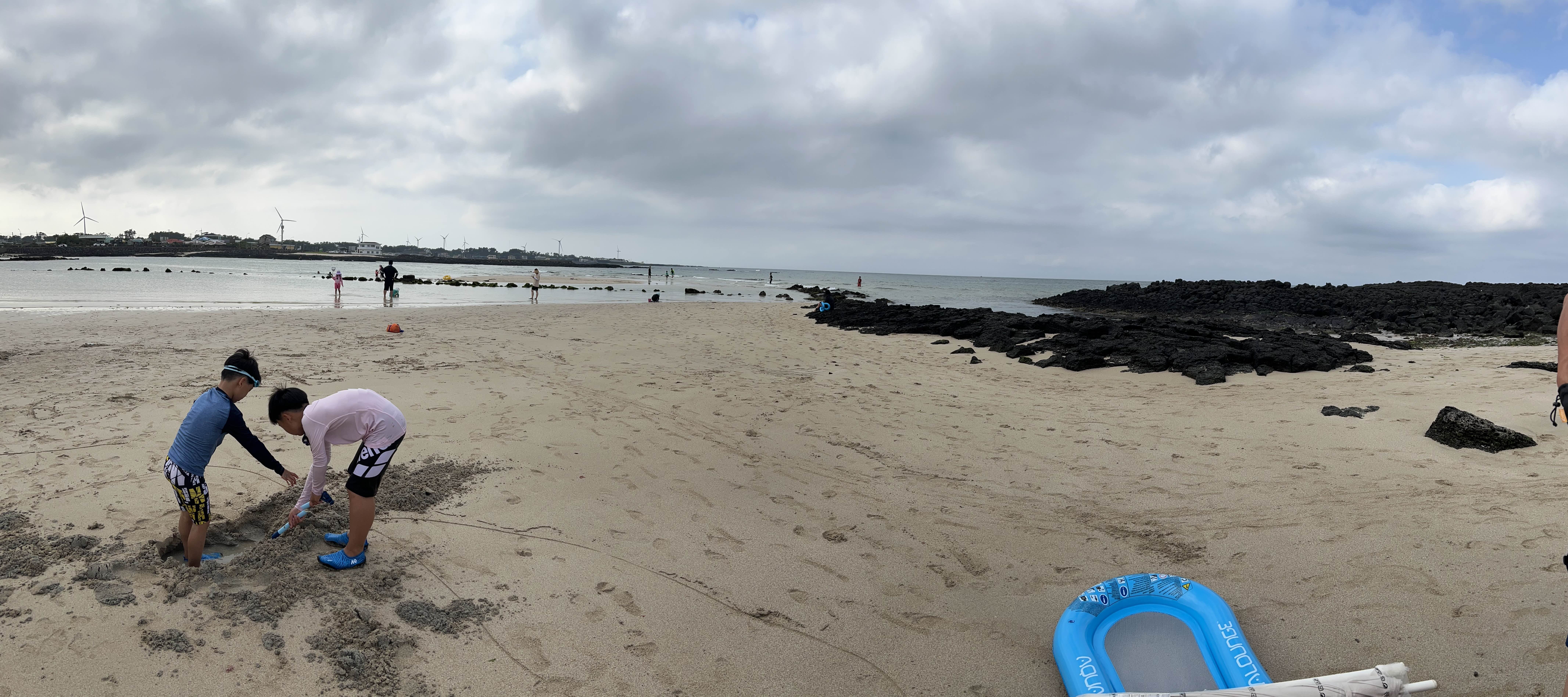 사람 북적이는 해변도 재미있지만, 사람 별로 없고 한가한 해변에서 노는 것도 즐겁습니다. 가져온 다이소 삽으로 구덩이도 파고, 글씨도 쓰고 한두시간 재미있게 놀다가 숙소로 다시 향합니다. 바닷물에 쩔은 아이들을 커다란 봉지에 그대로 넣어 모셔왔습니다. 남편이 준비한 커다란 비닐봉지가 이럴 때 빛을 발하네요.