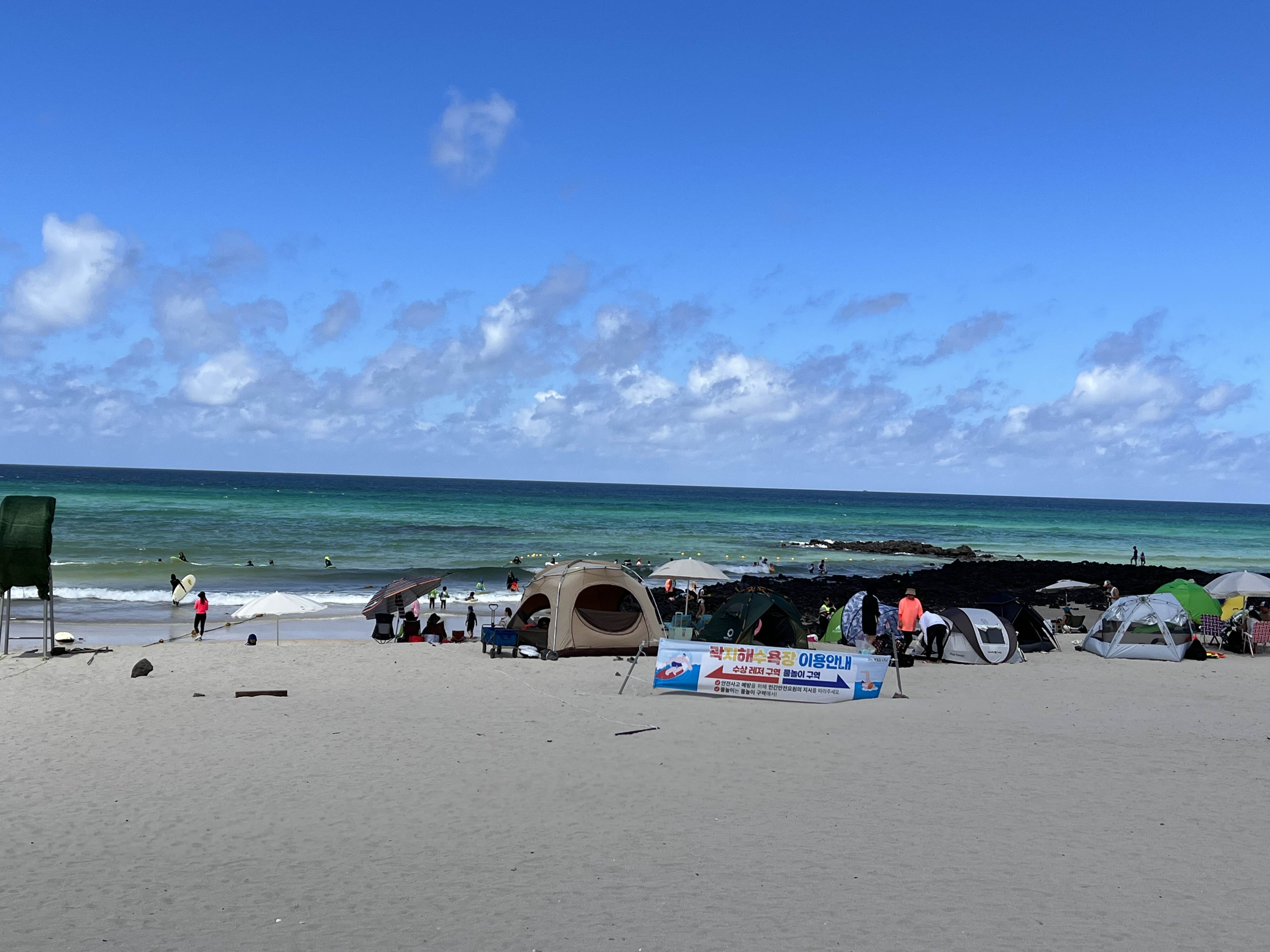 특이하게 안에는 유료야영장이 있어요. 해수욕도 즐기고, 야영도 하실 분들은 서측 주차장이 딱 좋으실 것 같아요. 근처에 유명한 빵집인 애월빵공장과도 가까운 위치라 근처 식당가를 편히 이용하시려면 곽지해수욕장 서측주차장이 편하실 것 같습니다. 혹은 곽지해수욕장에서 서핑하는 분들이 서핑을 하는 바다도 여기와 가장 가까워요. 보드 들고 이동하려면 힘든데 가까운 주차장 이용하시면 좋지 않을까요?