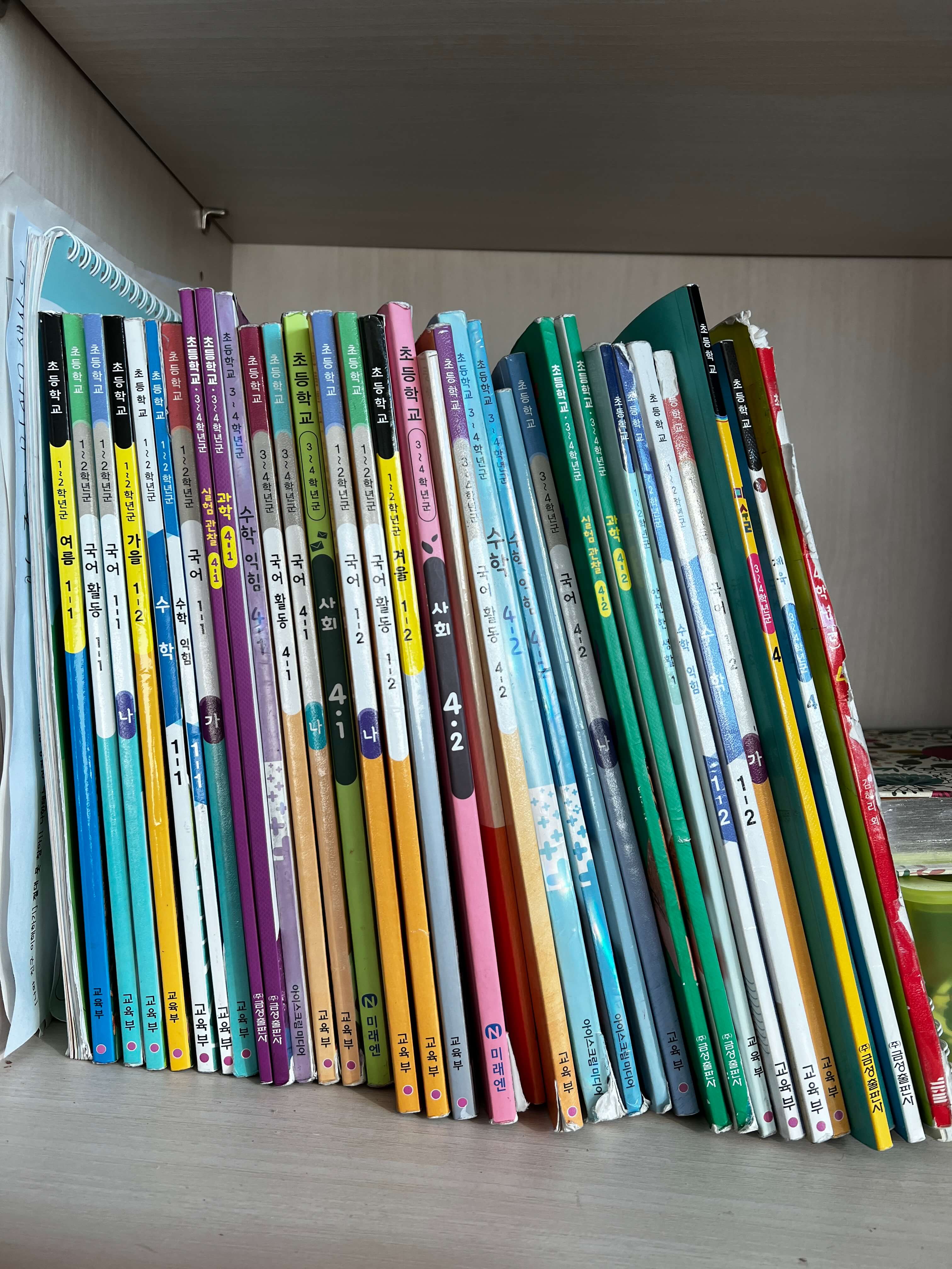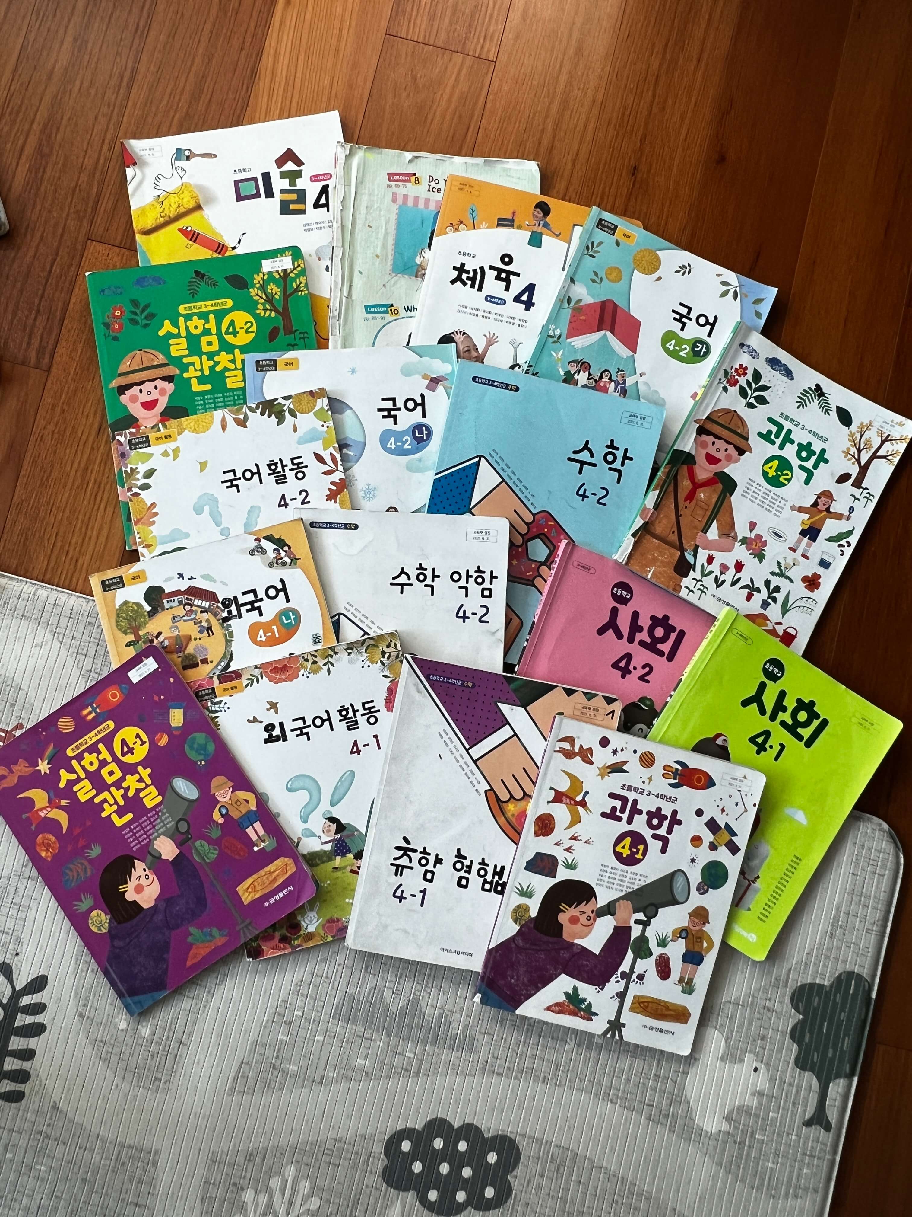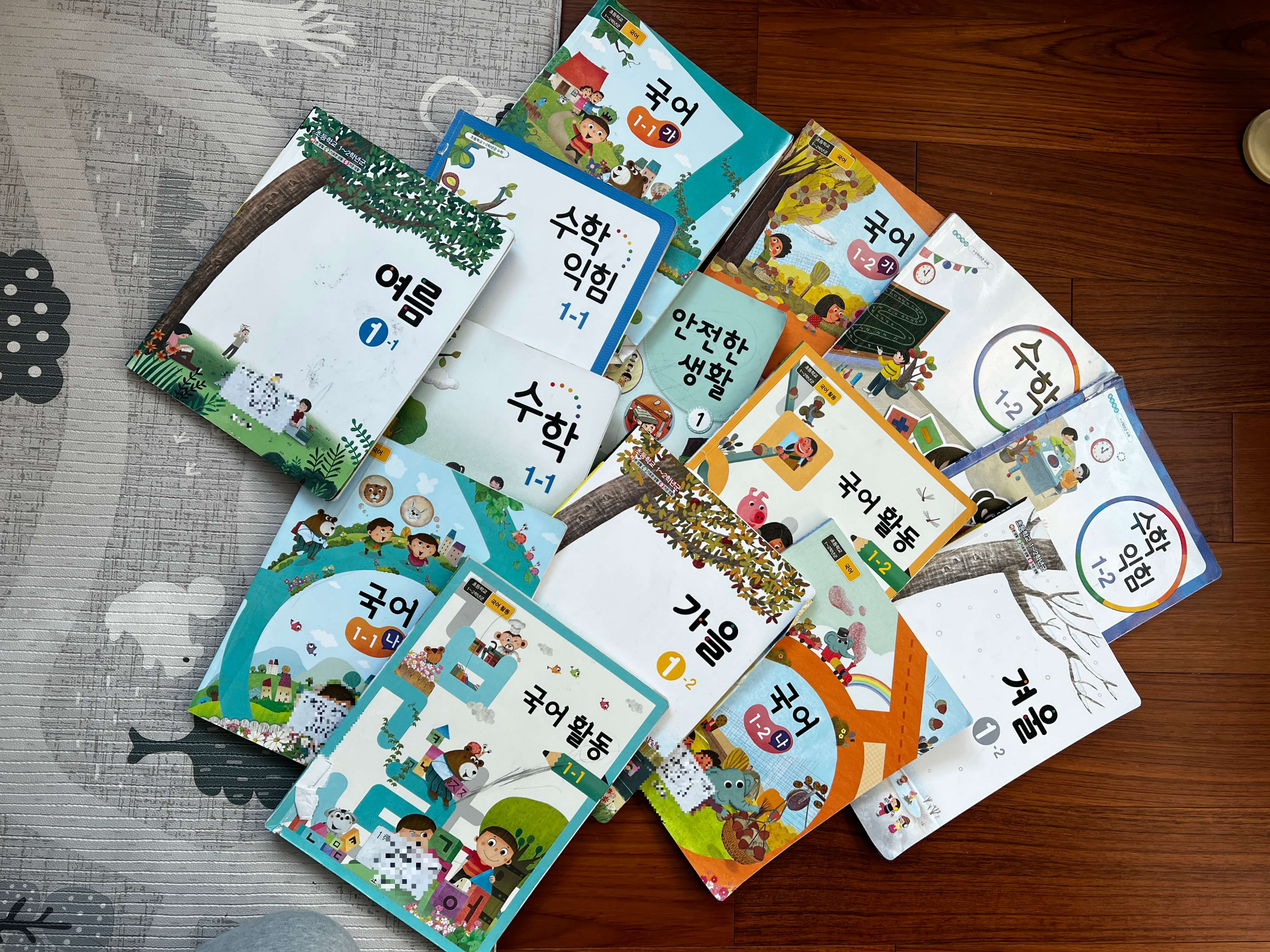 일단 저희 아이들이 가지고 온 교과서 떼샷입니다. 1학년과 4학년의 교과서가 섞여있네요. 1학년은 교과서에 봄 / 여름 / 가을 / 겨울이 있고요, 2학년부터는 사회나 과학으로 바뀝니다. 학교에 적응하기 위한 가이드북(?) 같은 교과서도 있어요. 4학년은 저희가 흔히 알고 있는 국어 / 영어 / 사회 / 과학이나 예체능 과목들이 있습니다. 출판사는 각 학교별로 다르기에 알록달록 표지도 예쁘네요.