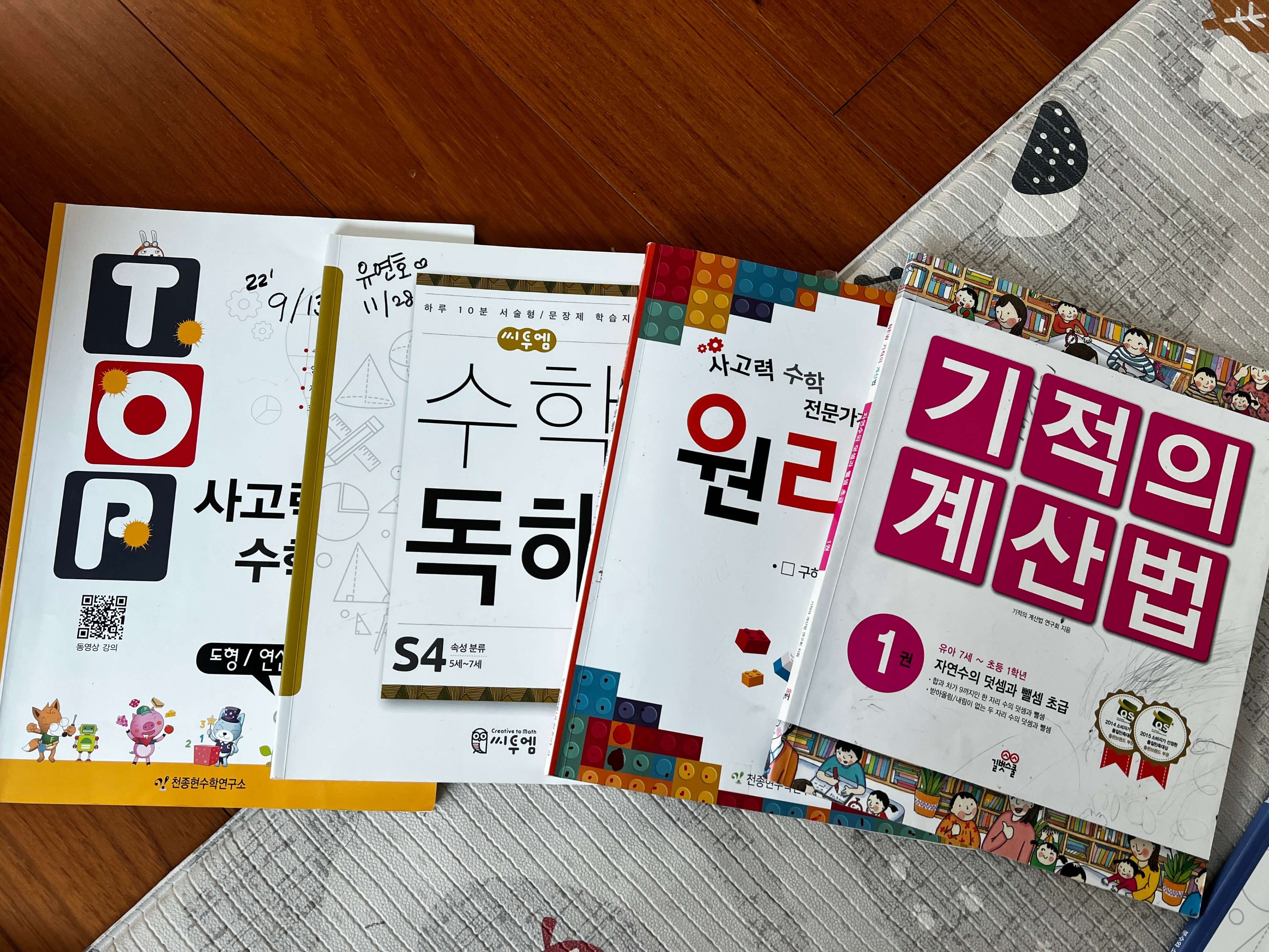 왼쪽이 1학년 어린이, 오른쪽이 4학년 어린이가 3달 정도 기간 동안 풀어놓은 문제집들입니다. 사실 수학이 아니고 국어가 중요하다는 생각은 많이 드는데, 1학년 어린이는 읽는 것보다 숫자가 더 쉽고 빠르기 때문에 수학 문제집에만 편중되어 있네요. 그나마 수학도 읽어야 풀 수 있는 수학독해 같은 문제집을 조금씩 넣어주었습니다.