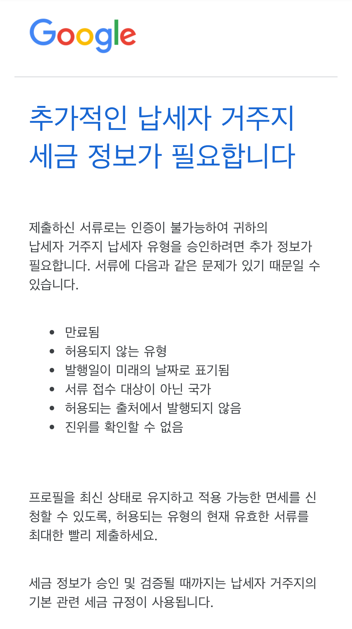 어느날부터 구글 홈페이지에 들어가면 뜨기 시작하는 경고문구, 추가적인 납세자 거주지 세금정보가 필요하다는 메시지를 해결해보도록 하겠습니다.