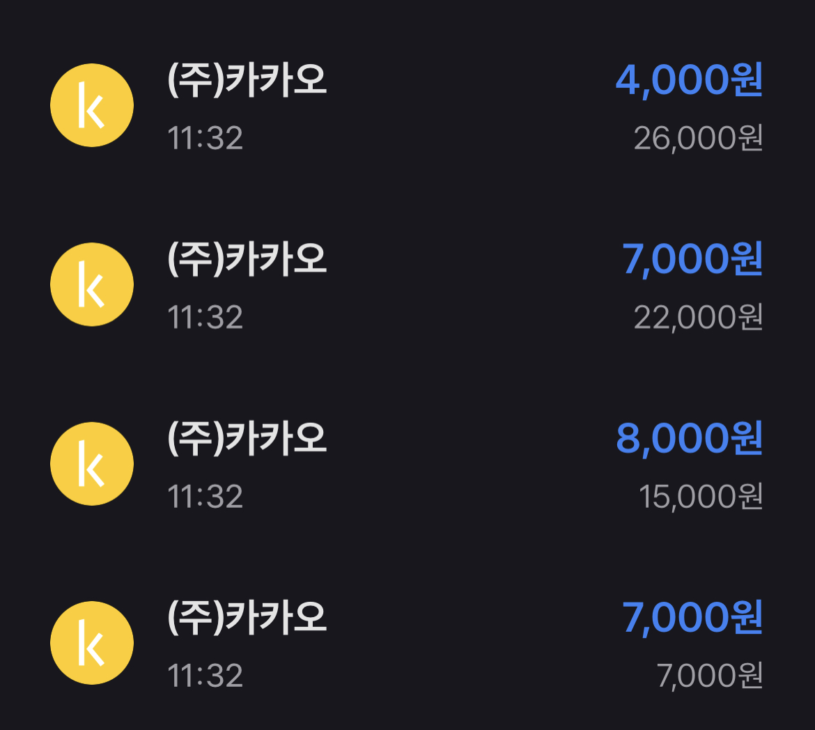 정말 솔직히 이제 거의 관심이 없어서 잊고있었는데 감사하게도 8월 수익은 26,000원이나 입금되었습니다. 카카오뷰는 콘텐츠 큐레이션 수익과 콘텐츠 광고수익으로 나뉘어지는데, 1개의 계정은 큐레이션 수익과 광고수익이 들어왔습니다. 나머지 2개의 계정은 아예 아무것도 하지 않아서인지 큐레이션 수익만 각각 입금되어 입금내역이 총 4개입니다.