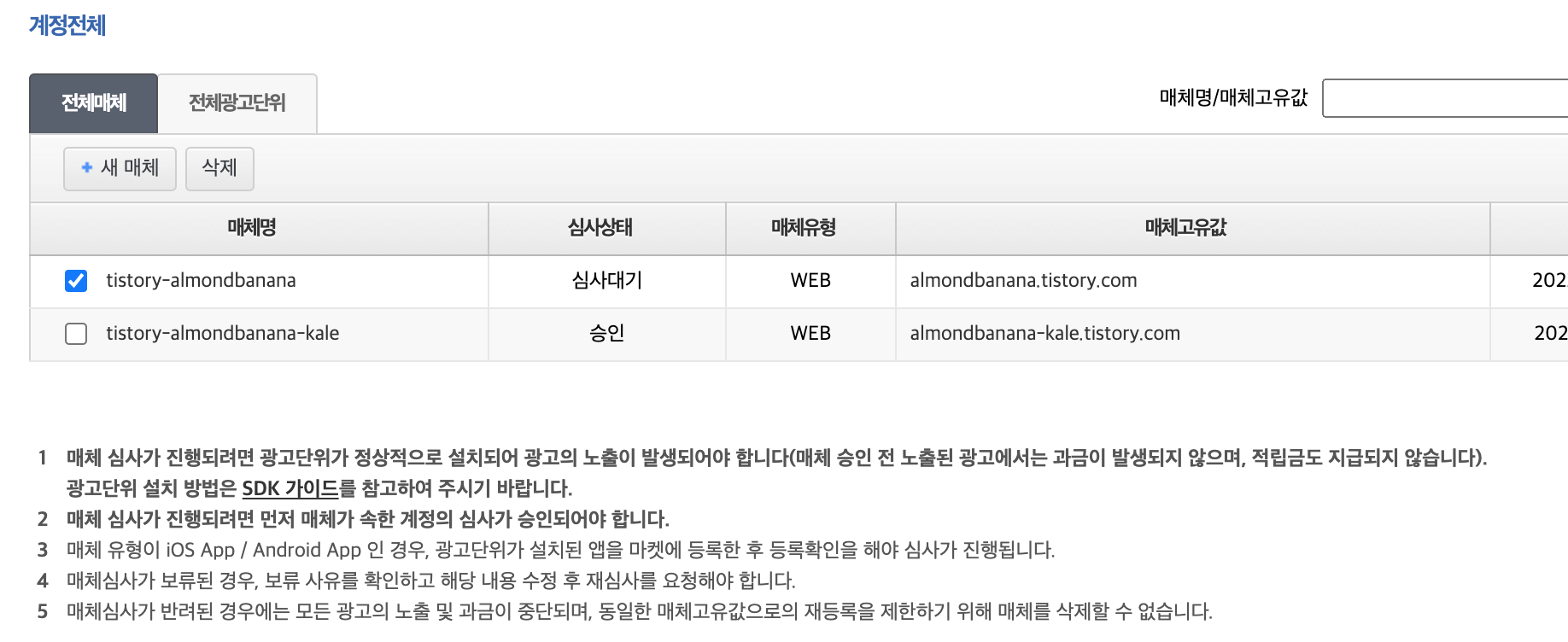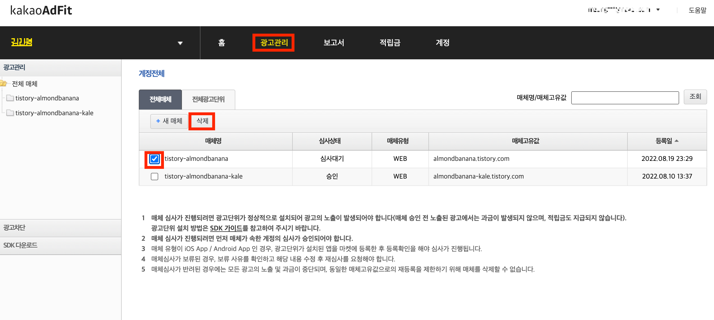 어째튼, 해결을 해야 하니 심사보류가 뜬 매체를 선택하고 삭제를 눌러줍니다.