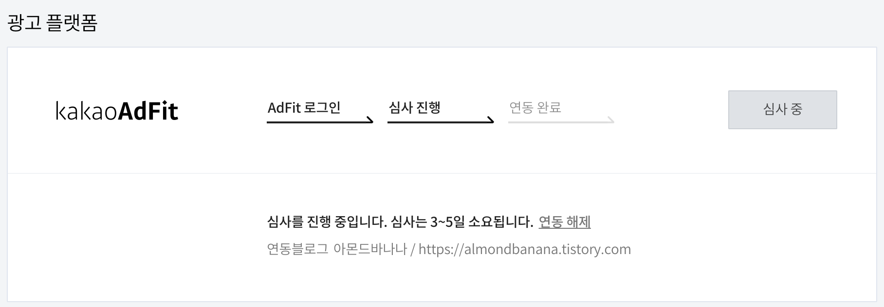 다시 연동을 신청해봅니다. 오, 그랬더니 이번에는 바로 심사진행이 뜨네요!