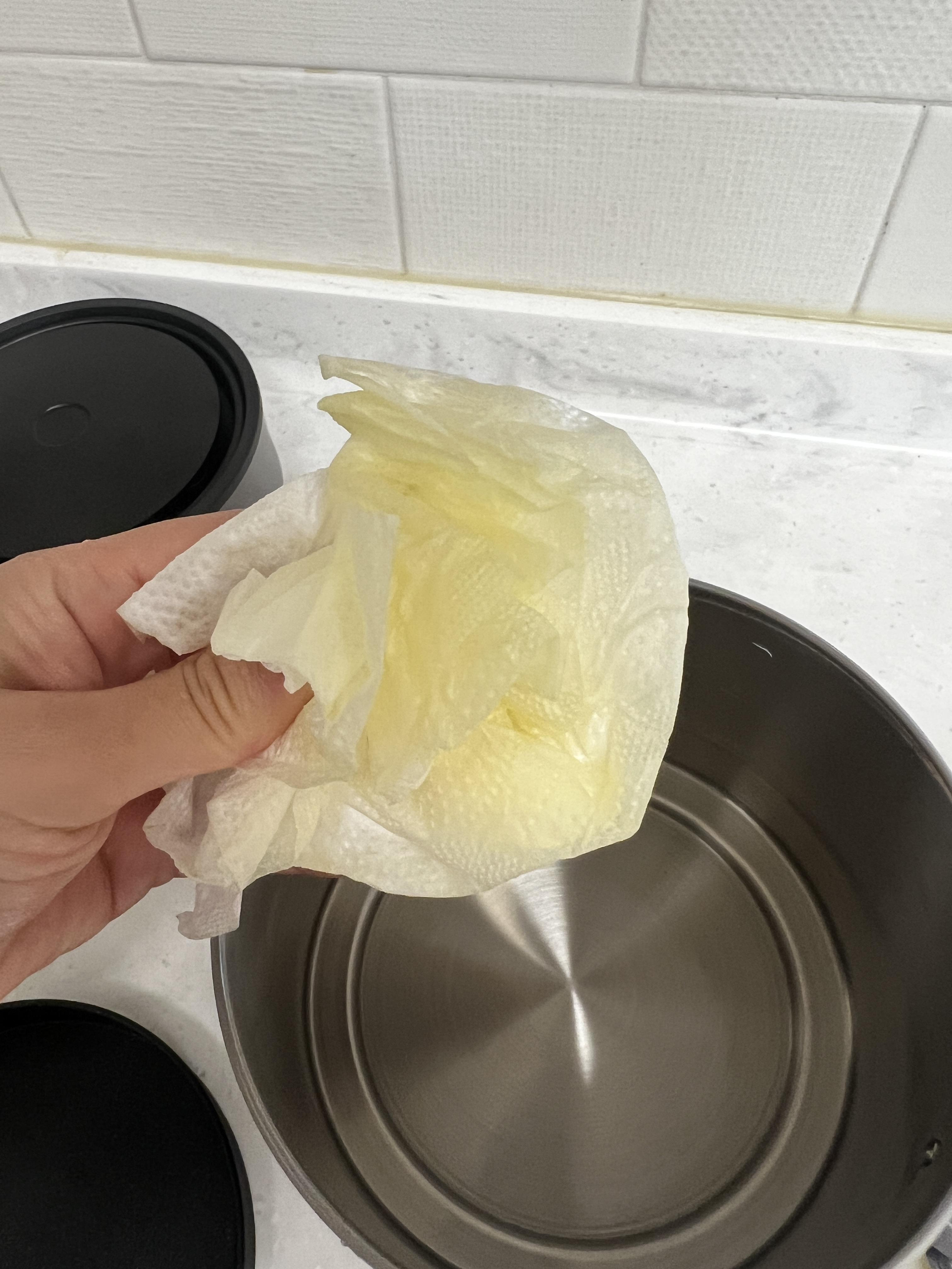 멀티쿠커의 바디는 아무래도 스텐으로 만들어진 제품이다보니 연마제가 있을 수 있어 식용류를 묻힌 키친타올로 닦아주었습니다. 의외로 몸체에서는 연마제가 나오지 않았고, 뚜껑같은 경우에는 둘레가 접혀있는 모양새이다보니 연마제가 조금 묻어나옵니다.