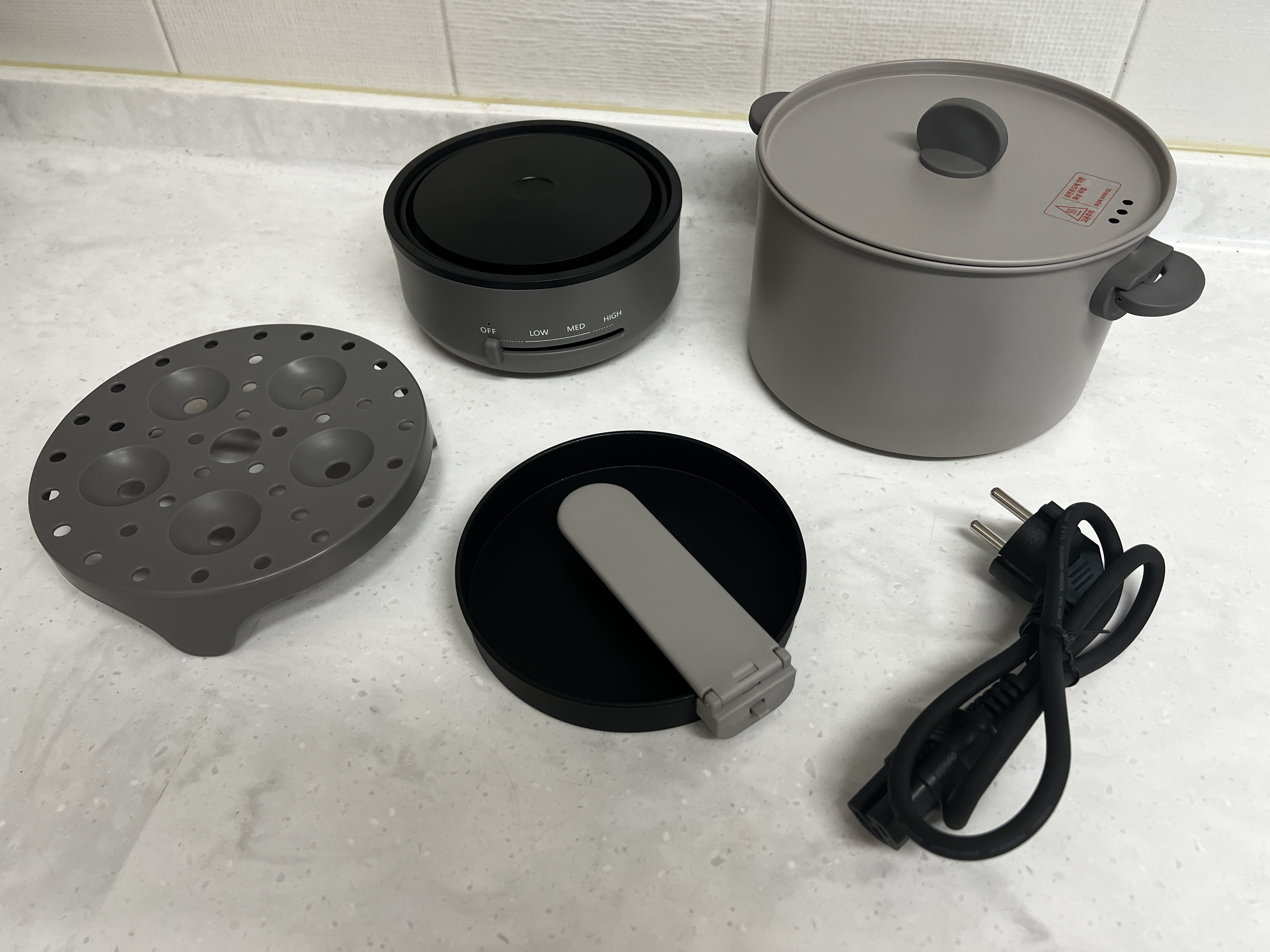 이미 멀티쿠커를 하나 가지고는 있지만 코베아 멀티쿠커의 구성은 좀 더 다채롭네요. 만두나 찐빵을 쪄 먹을 수 있는(과연 쪄 먹을 시간이 될지는 모르겠지만) 트레이와 간단한 계란후라이를 할 수 있는 작은 후라이팬도 포함되어 있습니다.