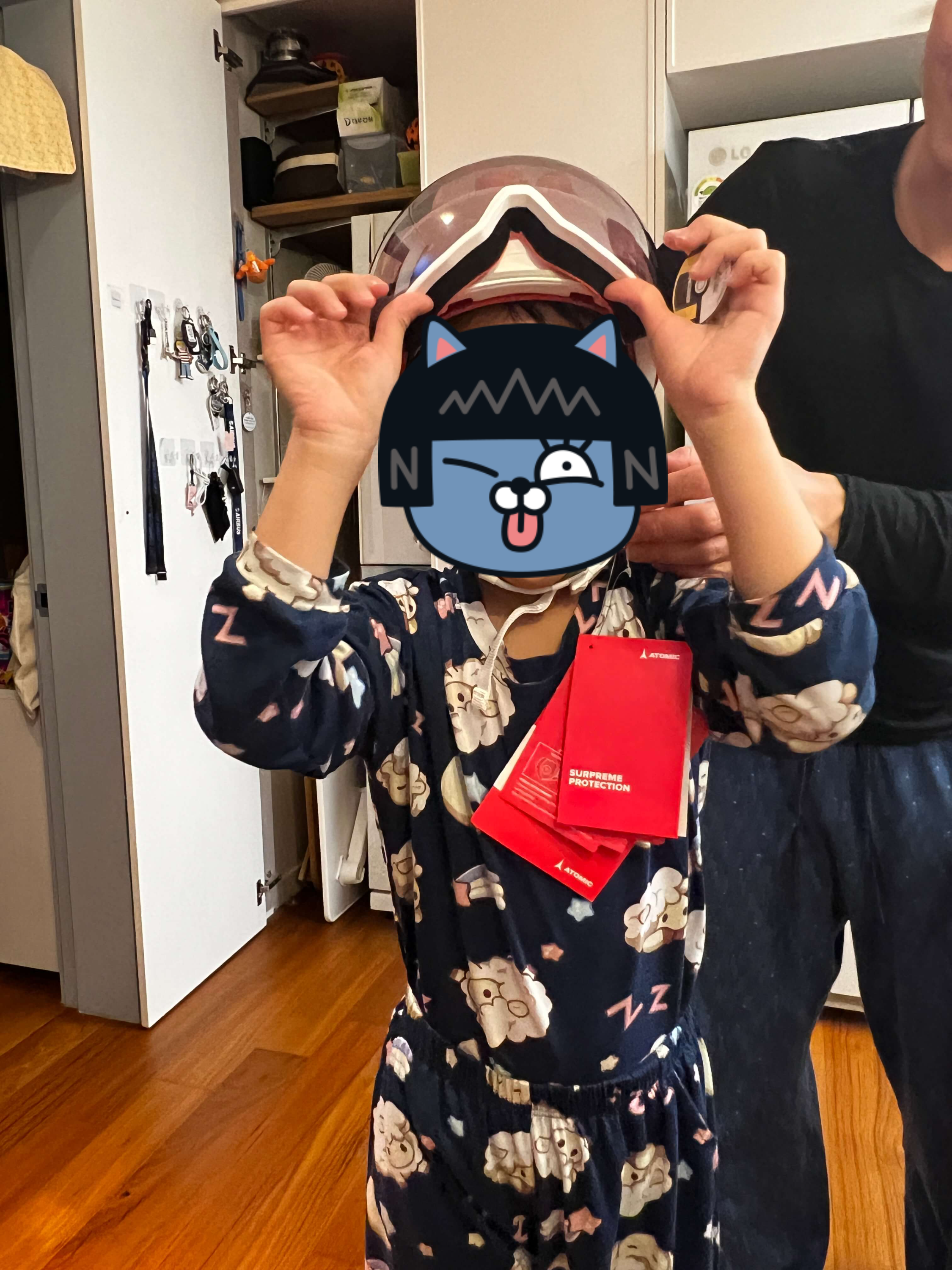 헬멧 뒤편으로 커다란 마스크 같이 보이는 것이 걸려있는데 고글을 사용하지 않을 때 고글에 씌워둘 수 있는 보호대랍니다. 아이들은 헬멧을 벗어 아무 데나 집어던지기 때문에 고글에 잔흠집가 종종 나는데, 보관할 때는 보호대를 씌워두면 조금이나마 잔흠집에서 고글을 보호할 수 있을 것 같습니다.