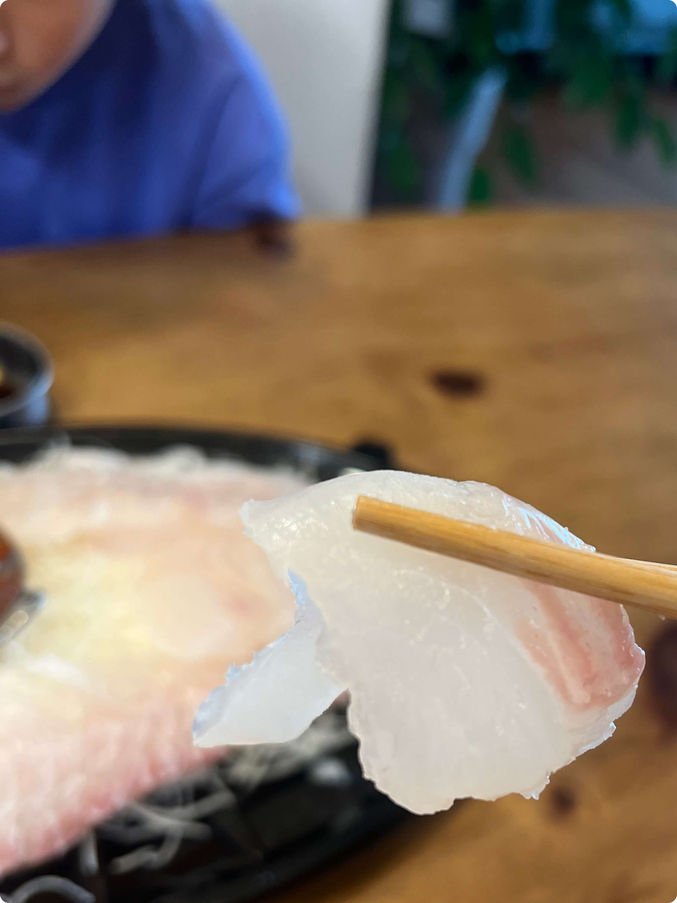 정신없이 1/3쯤 먹다가 문득 앞에 앉아있는 엄마가 생각났는지 젓가락을 얼른 가져다주며 한점 먹어보라고 권합니다. 저 두툼함 보이시나요? 개인적으로 회는 두툼하게 썰어 먹는 것을 좋아하는 편인데, 코스트코 광어회는 실하기도 하고 두툼하기도 해서 먹는 맛이 납니다. 물론 아이들의 경우 저 두께로 크기까지 크면 넘기는데 불편할 수 있어 가위로 조금씩 잘라주긴 했지만, 어른의 경우에는 괜찮을 것 같아요.