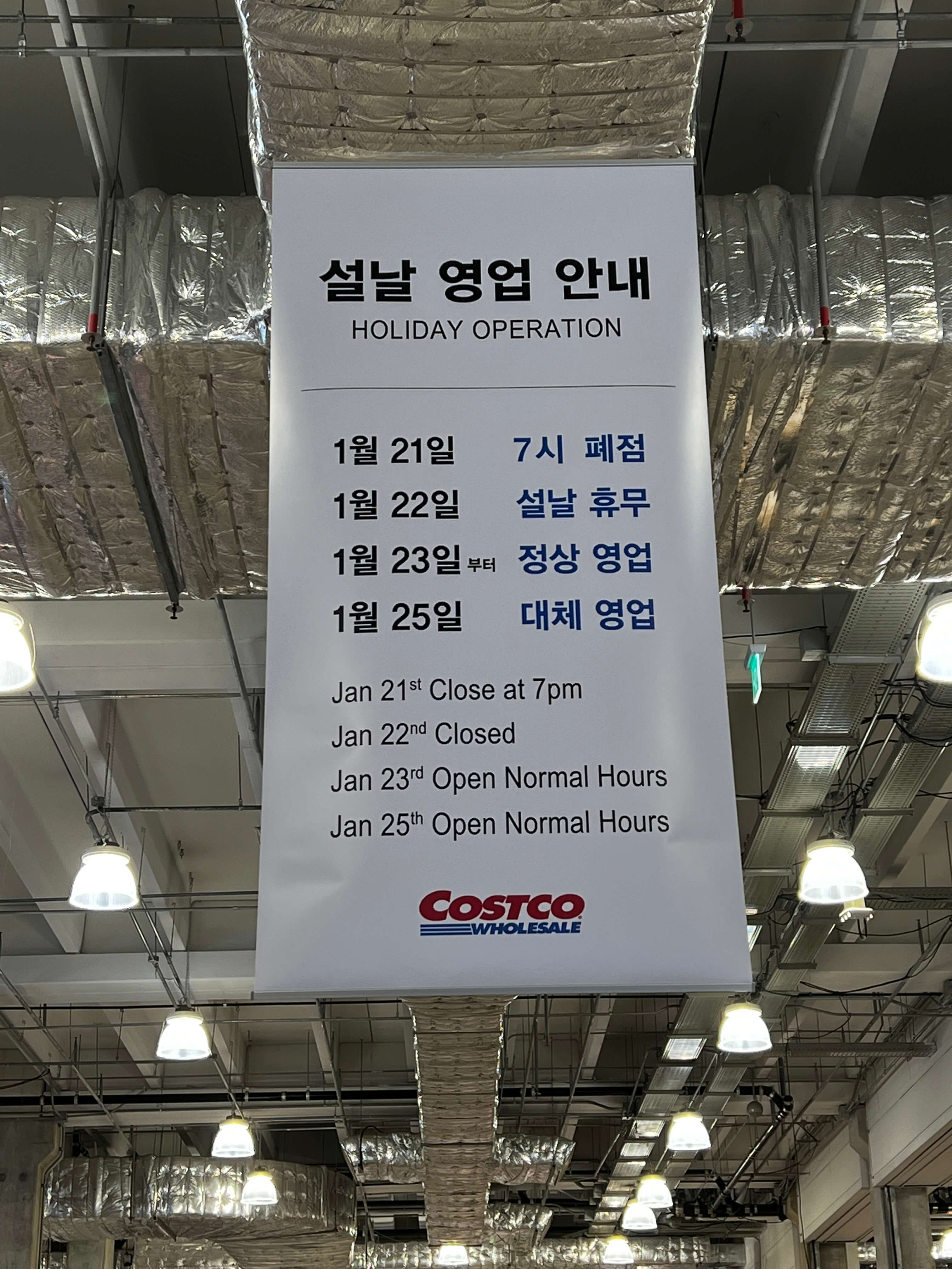 코스트코 일산점은 원래 격주 일요일이 아닌 '수요일'에 휴무를 하는데요. 이번에는 2023년 1월 25일(수)에 휴무하지 않고 정상영업을 한다고 합니다. 방문하실 분들은 이점 참고하셔서 방문하시면 될 것 같아요. 코스트코 지점에 따라 다르지만 대체로 격주 일요일에 휴무를 하기 때문에 일산점은 일요일에 언제든지 방문하셔도 된답니다.