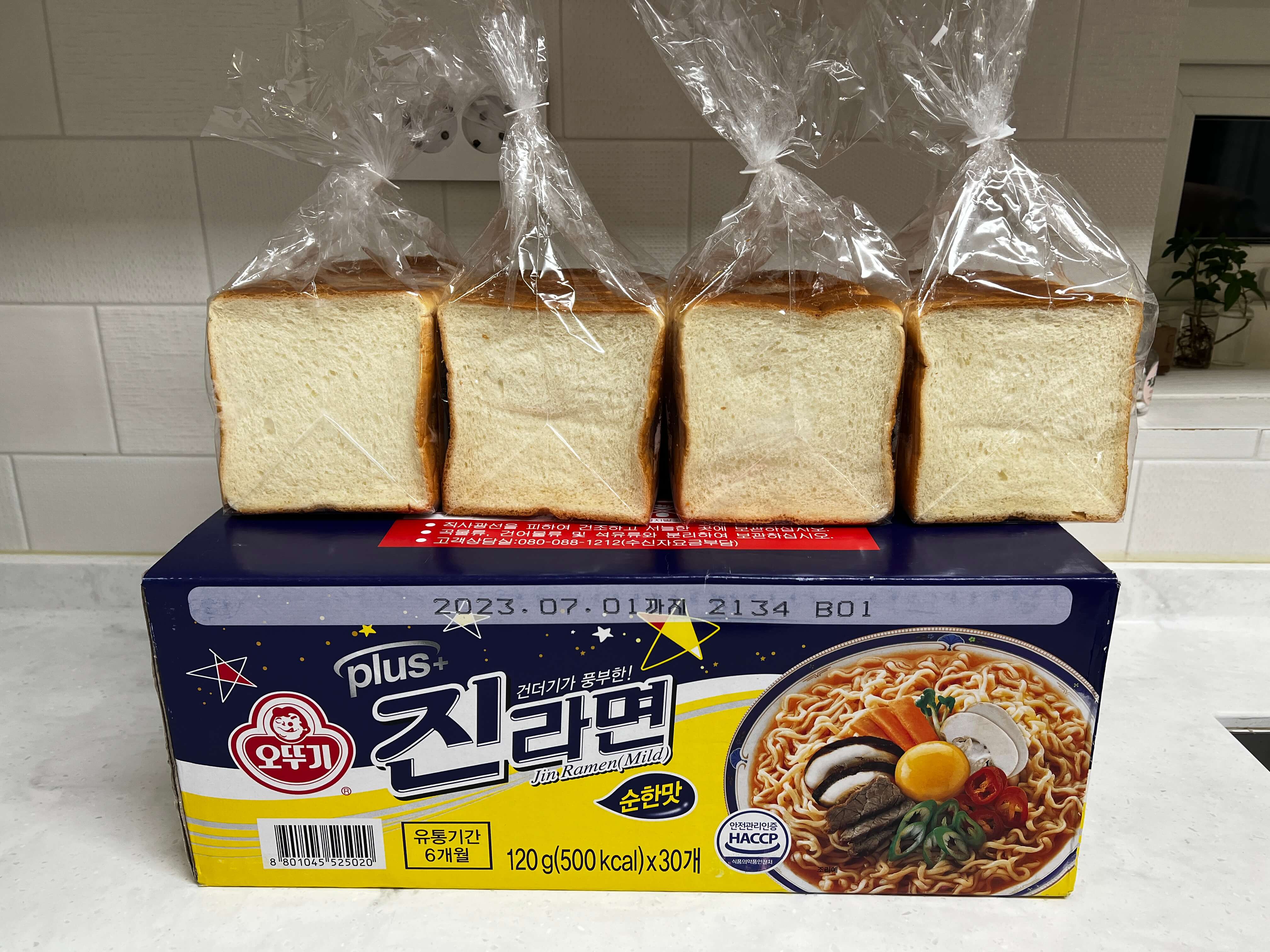 가급적 라면은 먹이지 않으려고 노력하지만 그래도 가끔 먹을 수밖에 없는(?) 진라면을 한 박스 쟁였습니다. 사실 라면만큼 먹기 간편한 식품이 없어서 남편의 반대를 무릅쓰고 한 박스 구매해 놓았네요. 나름 든든합니다. 샌드위치식빵은 4봉이 7,490원입니다. 가끔 아침으로 버터에 구운 식빵이나 에그프렌치토스트를 좋아하기에 사다가 바로 냉동실에 넣어둡니다.