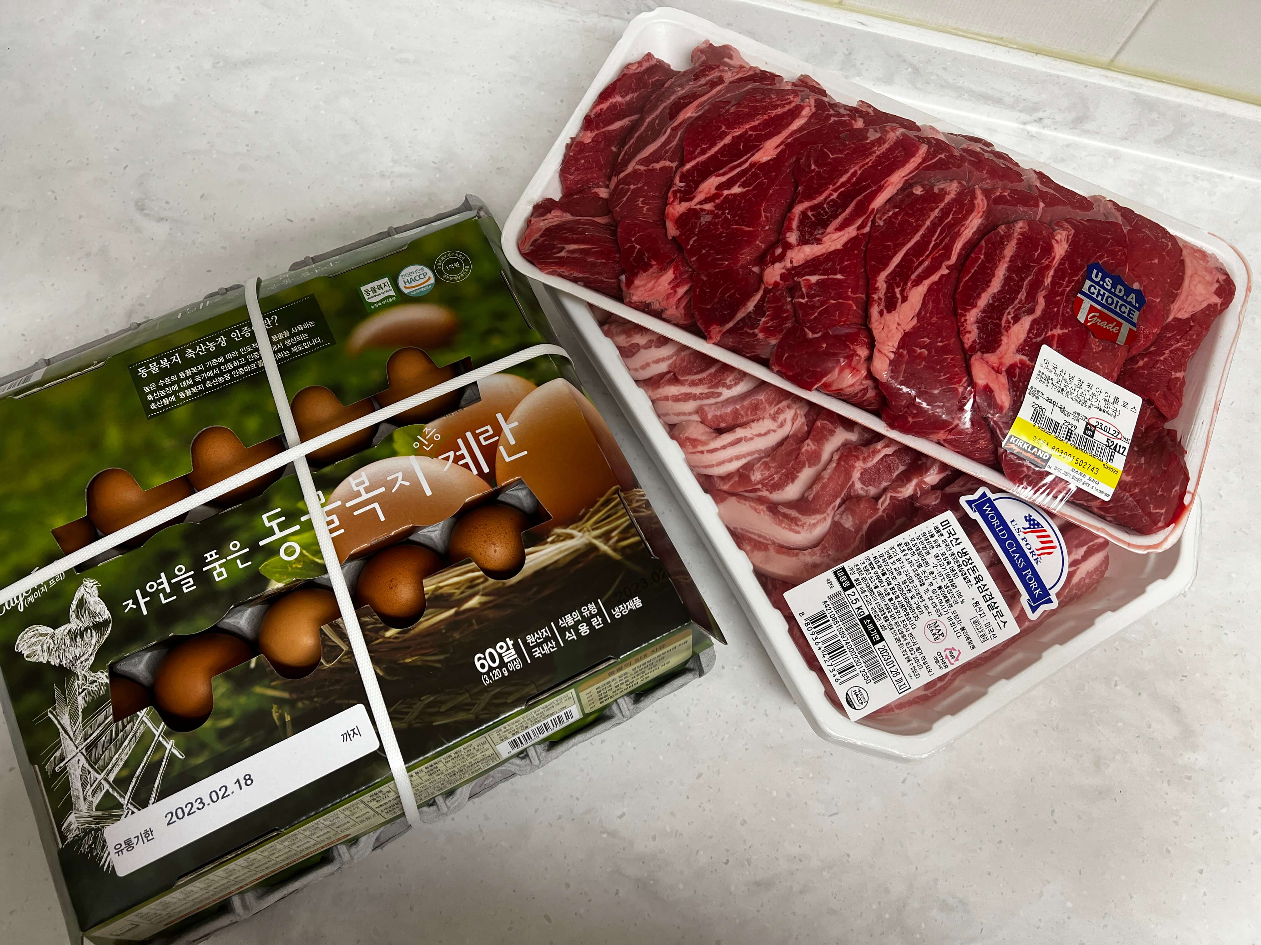 늘 구매하는 계란은 2 판란입니다. 계란값도 참 많이 올라서 어떨 때는 구매하기 부담스러울 때도 있지만 한번 사두면 늘 요긴하게 먹기 때문에 갈 때마다 2판씩 쟁여둡니다. 고기도 빠질 수 없죠. 삼겹살과 척아이롤 스는 미국산으로 구매했네요. 예전에는 한돈만 고집했었는데, 의외로 먹어보니 미국산도 나쁘지 않습니다(특히 가성비가요).