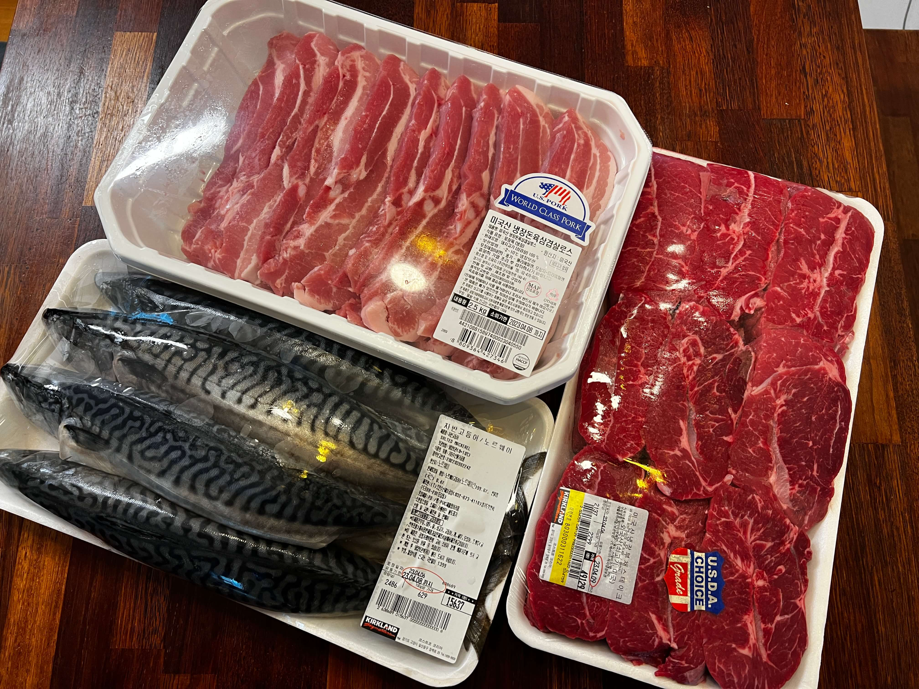 코스트코의 묘미는 고기죠! 오늘도 삼겹살과 부챗살 스테이크를 집어와 봅니다. 자반고등어는 저렇게 큰 자반고등어가 5마리 정도 들어있습니다. 코스트코 자반고등어는 사가지고 온 날 잘 손질해서 진공팩으로 포장해서 반은 냉동실에 넣어두고 반은 2~3일 동안 구워 먹습니다. 냉동실에 다시 들어가지 않고 바로 구워 먹은 고등어는 정말 맛있더라고요.