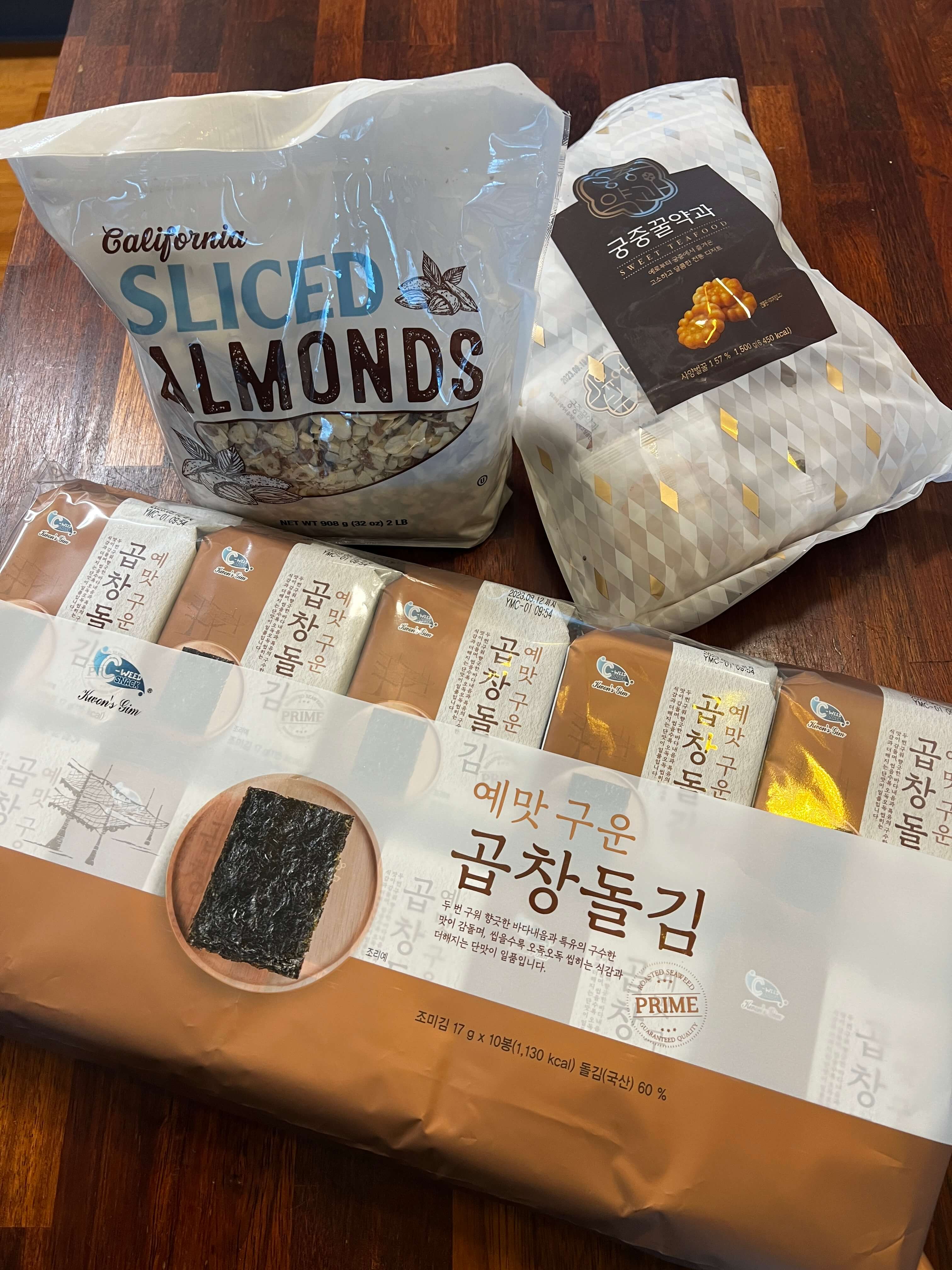 여전히 애정하는 곱창돌김. 예전 제품에 비해 봉지 수는 줄었지만, 1봉지가 예전 2 봉지의 크기로 변한지라 양의 차이는 없는 것 같아요. 먹어본 김 중에 저는 단연 최고라고 생각합니다. 너무 맛있어서 매달 구매하는 품목입니다. 최근 유행한다는 약과는 남편도 아이들도 좋아하기에 한 봉지 담았는데 1주일 만에 저 큰 봉지가 다 사라졌네요. 아몬드슬라이스는 혼자서 밥 먹기 귀찮을 때 셰이크에 살짝 넣어먹으려고 구매했어요.