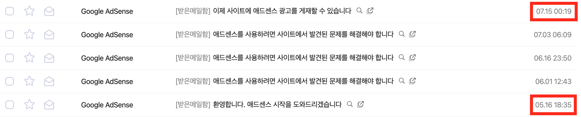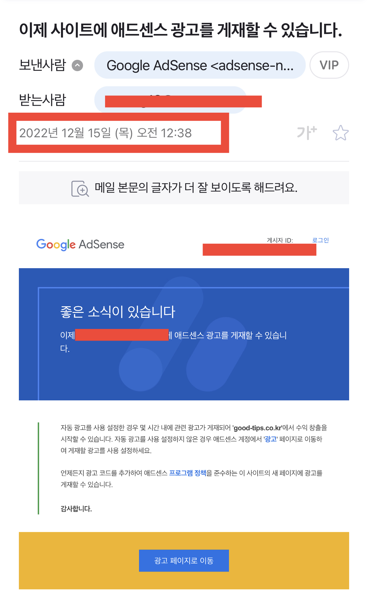 글이 약 24개 정도 되고 블로그를 개설한 지 약 28일쯤 되었을 때, 티스토리 플러그인 기능을 사용하여 애드센스에 연결해주었습니다. 블로그를 개설했을 때 바로 2차 도메인을 가비아에서 구매하여 연결해 두었고요. 신청은 12/14 오후 4시 즈음했는데, 승인된 메일을 보면 12/15 새벽 12시 즈음입니다. 사실 신청하고 하루도 걸리지 않아 승인이 된 것이죠.