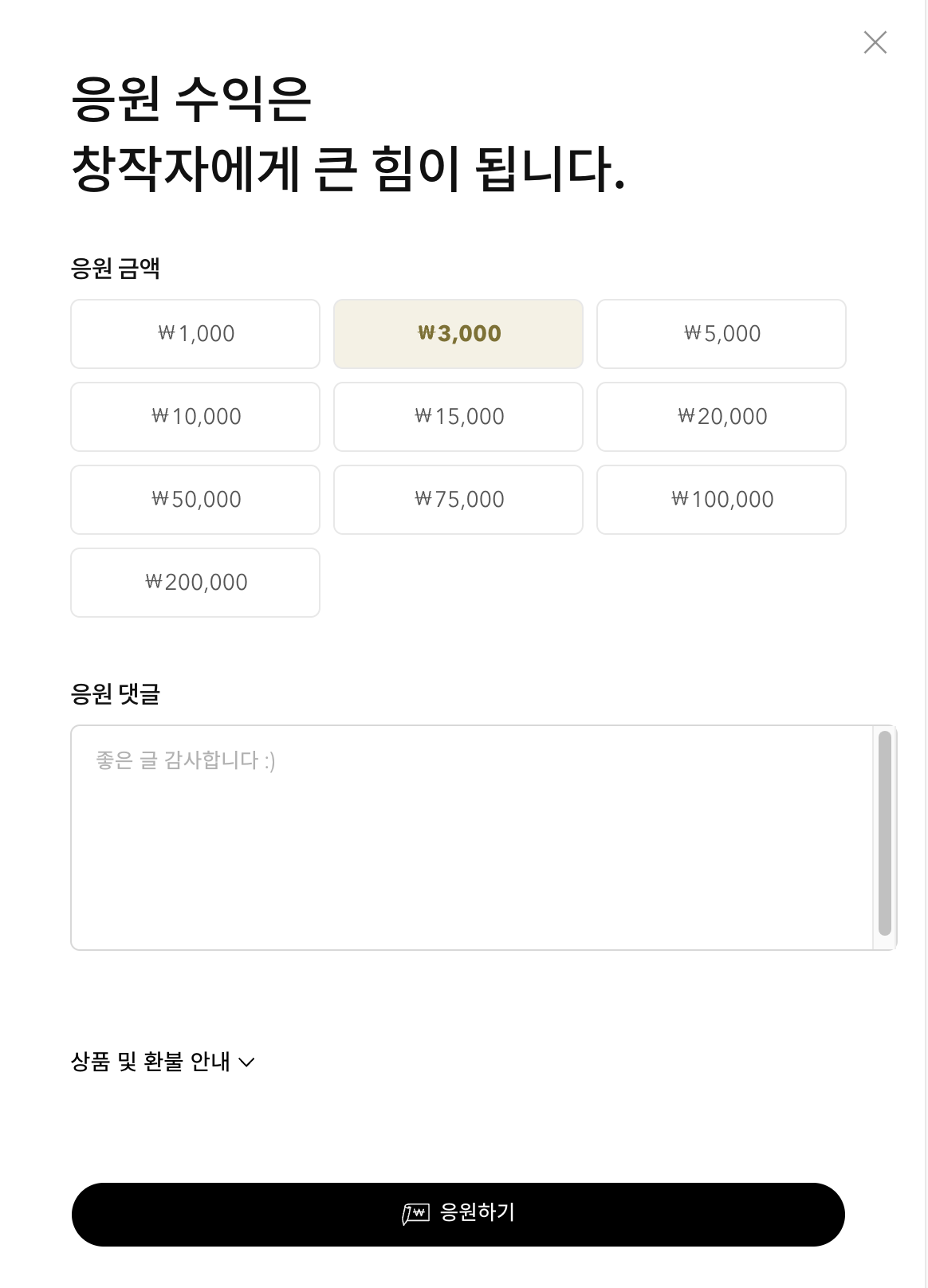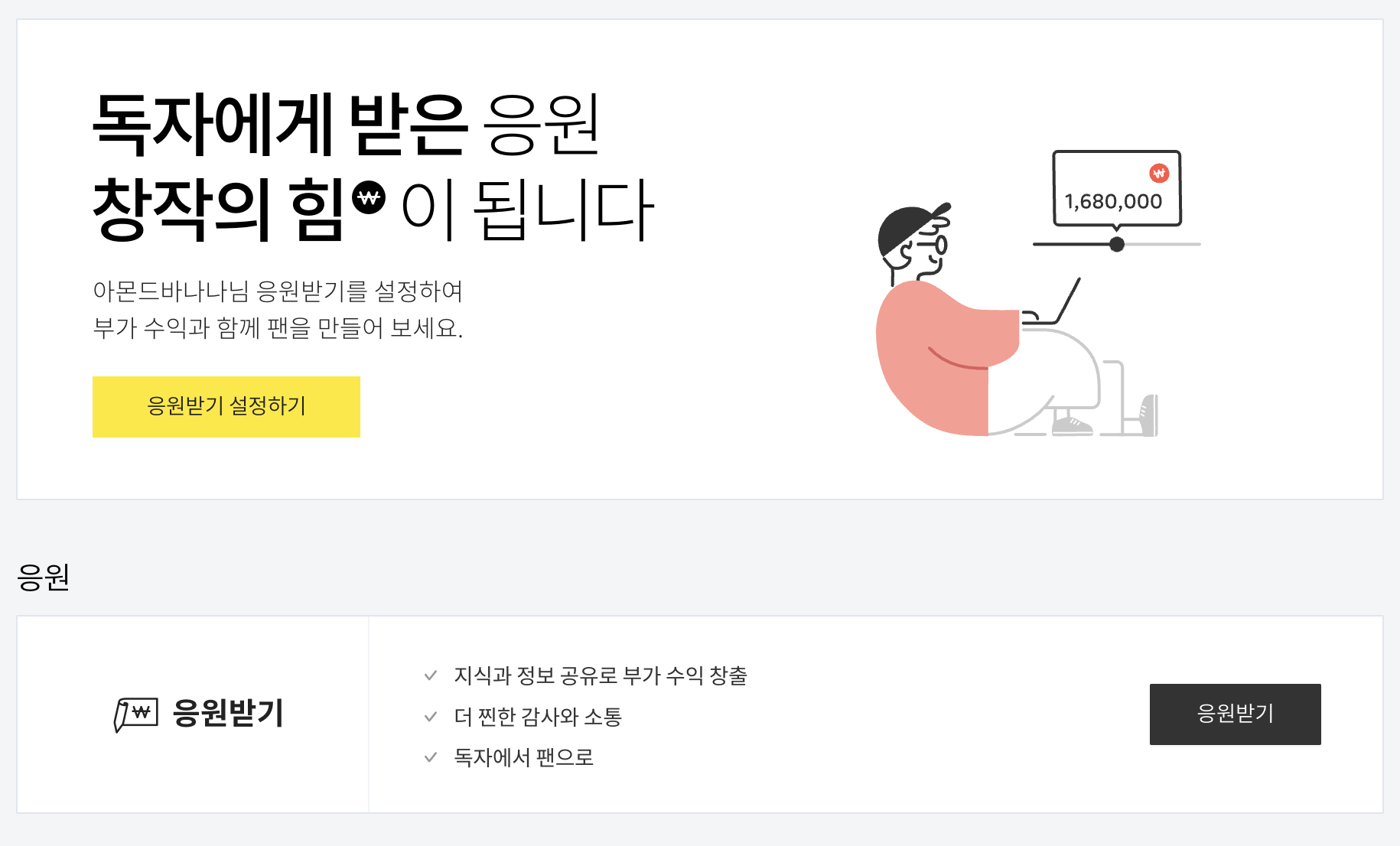 다시 티스토리 수익탭으로 가신 후, 응원받기로 들어가시면 [응원받기 설정]이 나옵니다. 클릭해주시면 응원받기가 이제 설정된 것을 확인하실 수 있습니다. 이제 제 글로 들어가 확인해보니 댓글창에 [응원하기]가 생겼네요. 살포시 눌러보니 아래와 같이 창작자에게 큰 힘이 된다는 응원하기의 금액이 나옵니다.