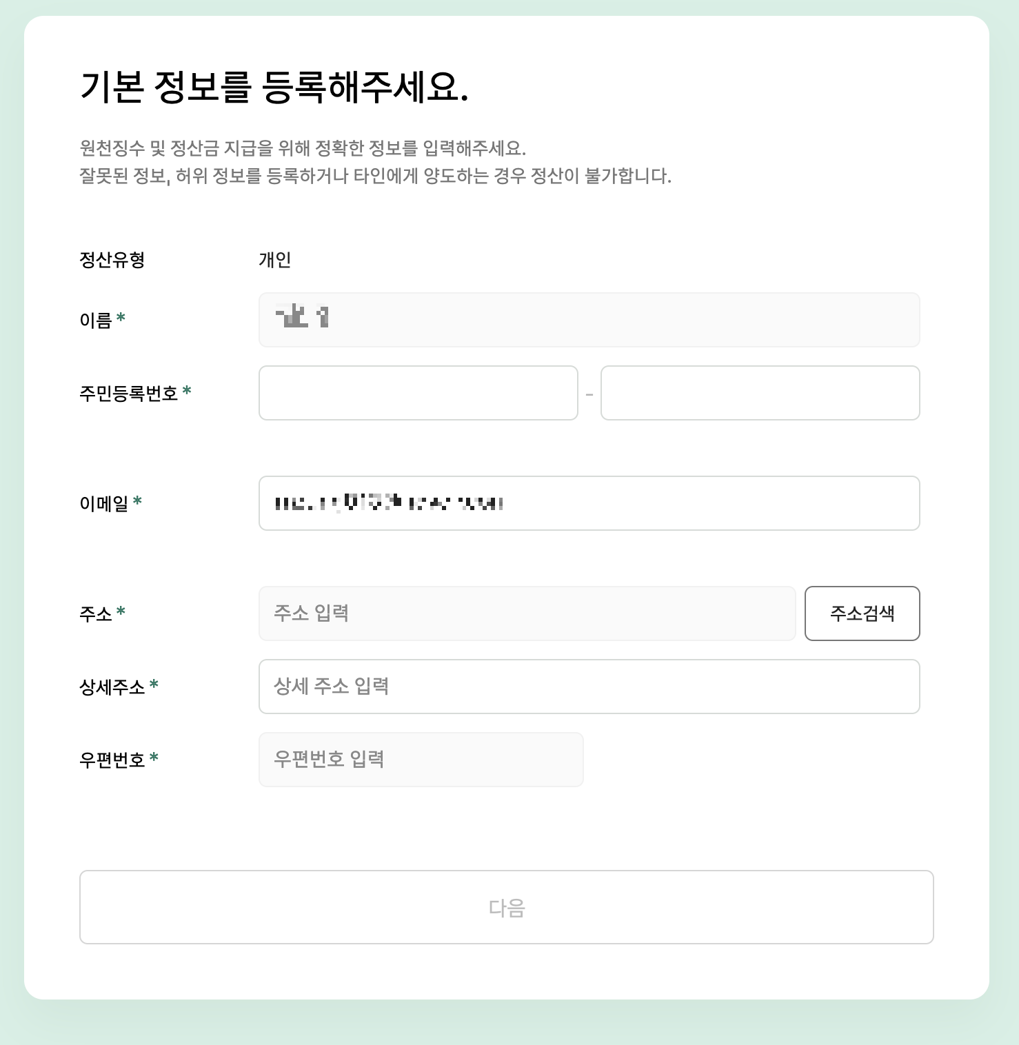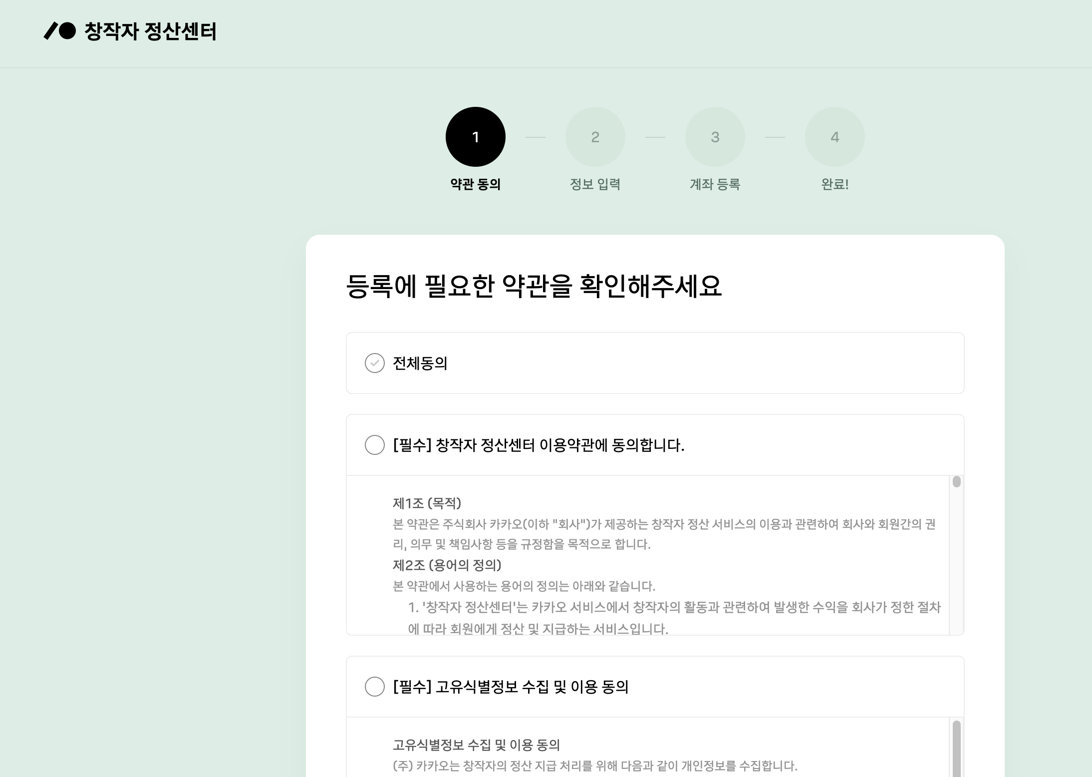 티스토리 응원하기를 설정하려면 일단 창작자 정산센터에서 기본적인 정보를 입력해야 합니다. 카카오뷰가 생각나는 창작자 정산센터에는 자동으로 연결이 됩니다. 약관을 확인하고 동의에 체크한 후, 기본정보를 입력해줍니다.