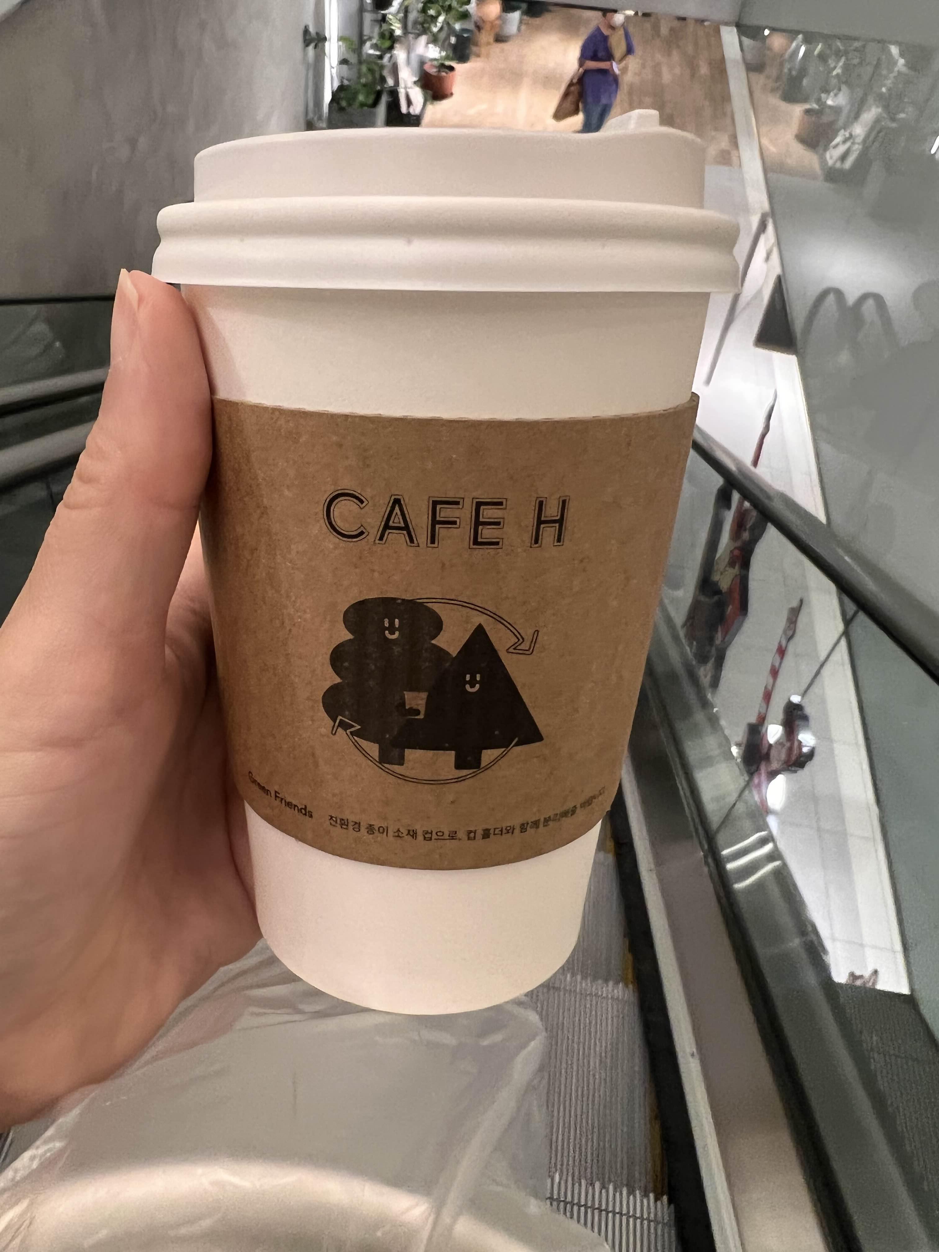 엘리베이터에서 내리자마자 이런 카페가 있습니다. 여기가 바로 h카페에요. 현대백화점의 다른 지점 h카페보다 훨씬 더 쾌적하고 넓은 것 같았어요. 음료는 커피나 리치주스 같은 간단한 것으로 선택할 수 있습니다만 뜨아는 있는데 아아는 없어요. 아쉽지만 시원하게 마시고 싶어 리치주스를 선택해보았습니다.