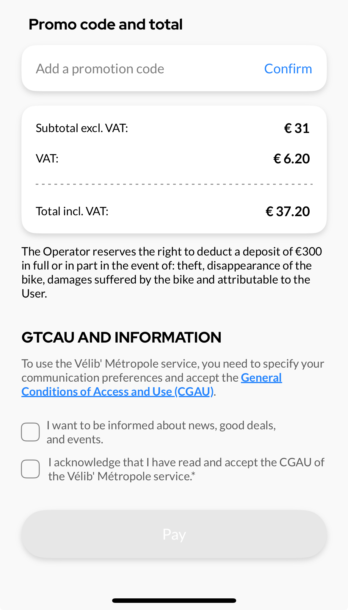 프로모션 코드가 있다면 넣어주면 되는데 프로모션 코드를 아무리 찾아보려 해도 발견할 수 없어 넘어갔다. 부가세를 합하여 일반자전거를 이용할 수 있는 V-Plus는 37.20유로이다.