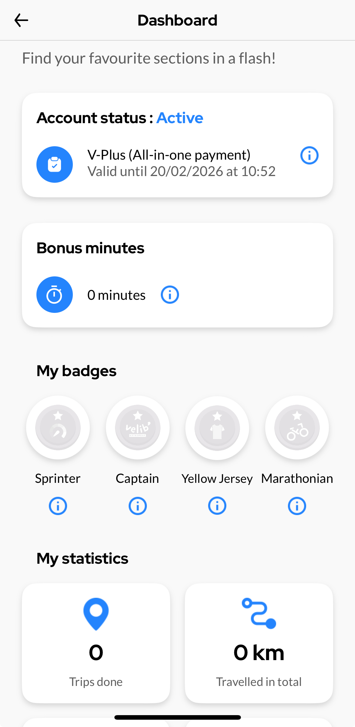 결제가 완료되면 벨리브앱 Dashboard에서 나의 벨리브가 활성화된다. 대쉬보드를 확인하면 내가 어디를 얼만큼 다녔는지를 확인할 수 있다. 자전거를 실제로 타보면 자전거 계기판에 시간이 나오기는 하는데 자전거가 노후된 탓에 계기판이 잘 보이지 않는다. 30분이 넘으면 추가 금액이 부과되기 때문에 시간을 잘 체크해서 자전거를 이용해야 한다.
