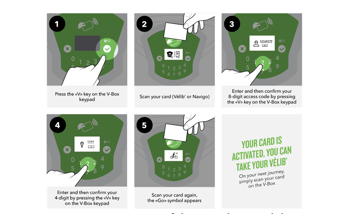 벨리브를 이용하려면 자전거 보드판의 오른쪽 체크버튼을 누른 후, 카드 또는 아이폰으로 잠금 해제하고 이용할 수 있다.