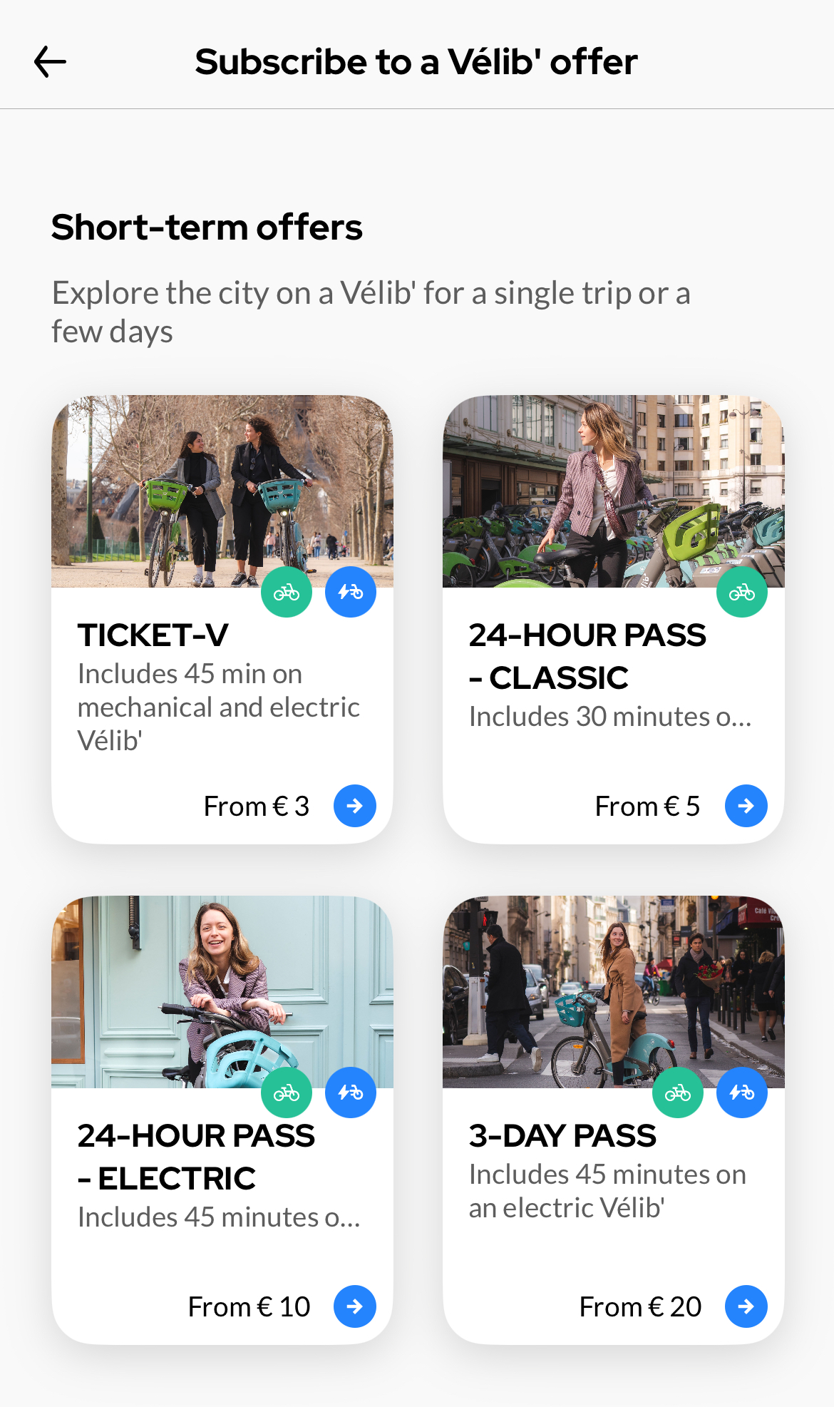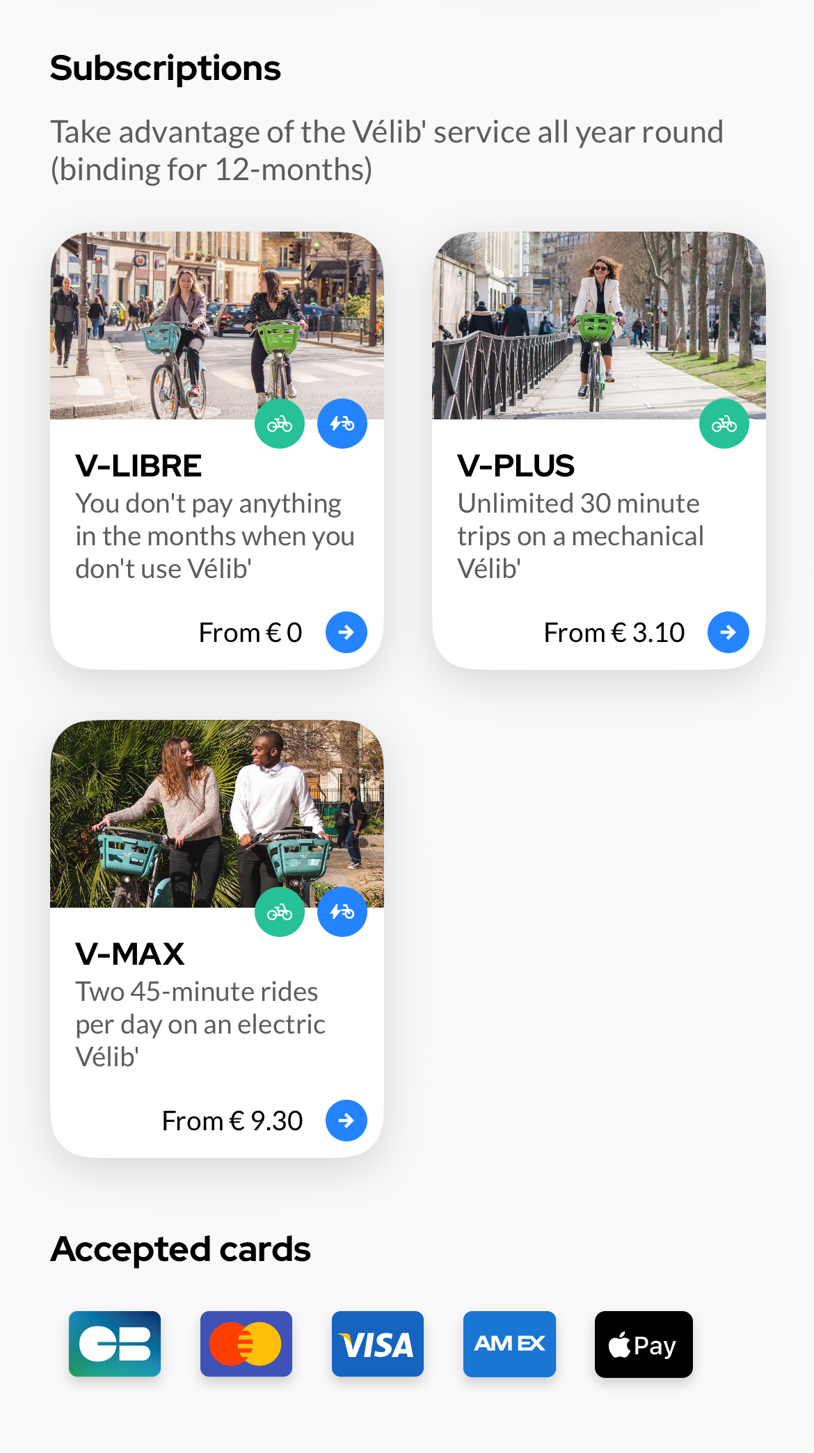 언덕이 꽤 있는 파리는 전기자전거를 타는 사람도 정말 많은데 아주 많이 타지는 않을 것 같아 V-Plus로 결제했다. 결제는 신용카드 로고를 선택하여 카드를 선택한 후, 카드번호와 CVC번호를 넣고 결제하면 된다. 애플페이로 결제가 가능하여 애플페이에 저장된 현대카드로 바로 결제가 완료되었다.